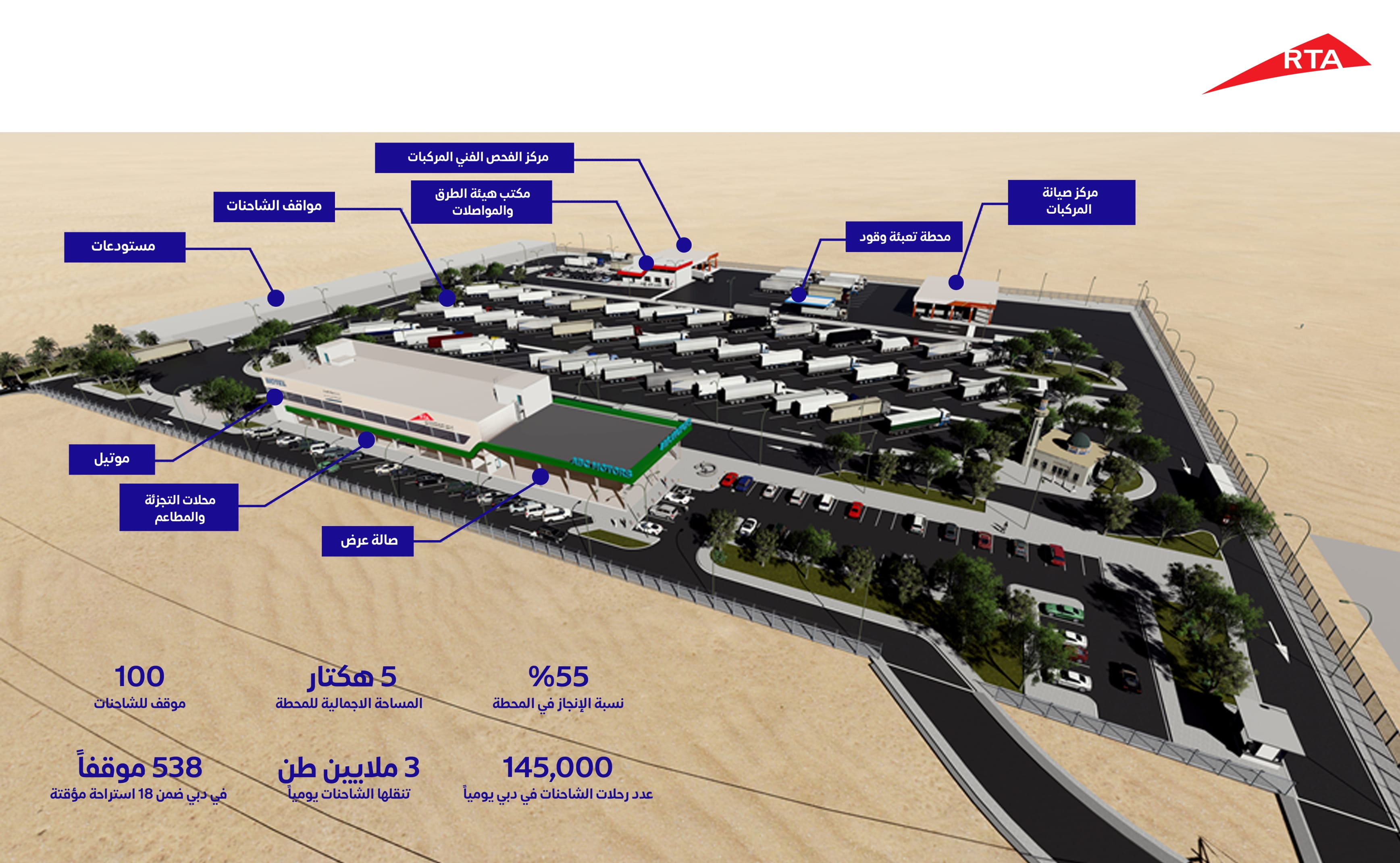 أعلن معالي مطر محمد الطاير المدير العام ورئيس مجلس المديرين في هيئة الطرق والمواصلات، إنجاز 55% من مشروع إنشاء محطة متكاملة لاستراحة الشاحنات، في مدينة دبي لاند بالقرب من شارع الإمارات، وذلك بالشراكة مع القطاع الخاص، وتعد هذه الاستراحة أول منطقة متكاملة لاستراحة الشاحنات تلبي جميع الاحتياجات الأساسية واليومية لسائقي الشاحنات والمركبات الثقيلة على مستوى إمارة دبي.