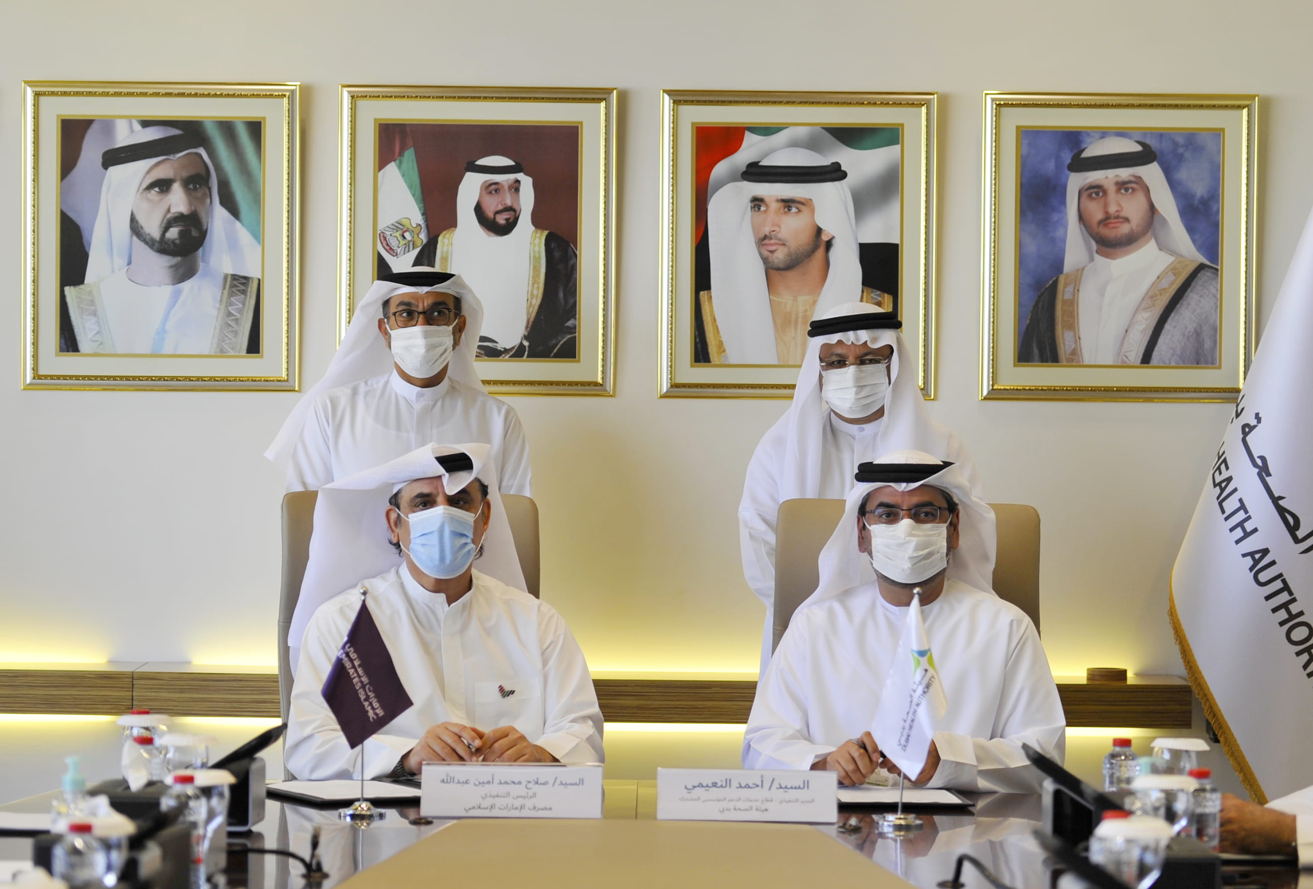 جاء ذلك بموجب مذكرتي تفاهم وقعتها الهيئة في مقر إدارتها، اليوم، ومصرف الإمارات الإسلامي، بحضور معالي حميد محمد القطامي مدير عام هيئة الصحة بدبي، وسعادة هشام قاسم رئيس مجلس ادارة الإمارات الإسلامي ونائب رئيس مجلس الإدارة والعضو المنتدب لبنك الإمارات دبي الوطني، فيما وقع على المذكرتين من الهيئة أحمد النعيمي المدير التنفيذي لقطاع الدعم المؤسسي المشترك، ومن المصرف صلاح محمد أمين عبد الله الرئيس التنفيذي للإمارات الإسلامي، إلى جانب عدد من المسؤولين والمختصين من الجانبين، منهم: عواطف الهرمودي المدير العام للعمليات ،خالد النقبي رئيس الاعمال المصرفية للشركات في الامارات الإسلامي.