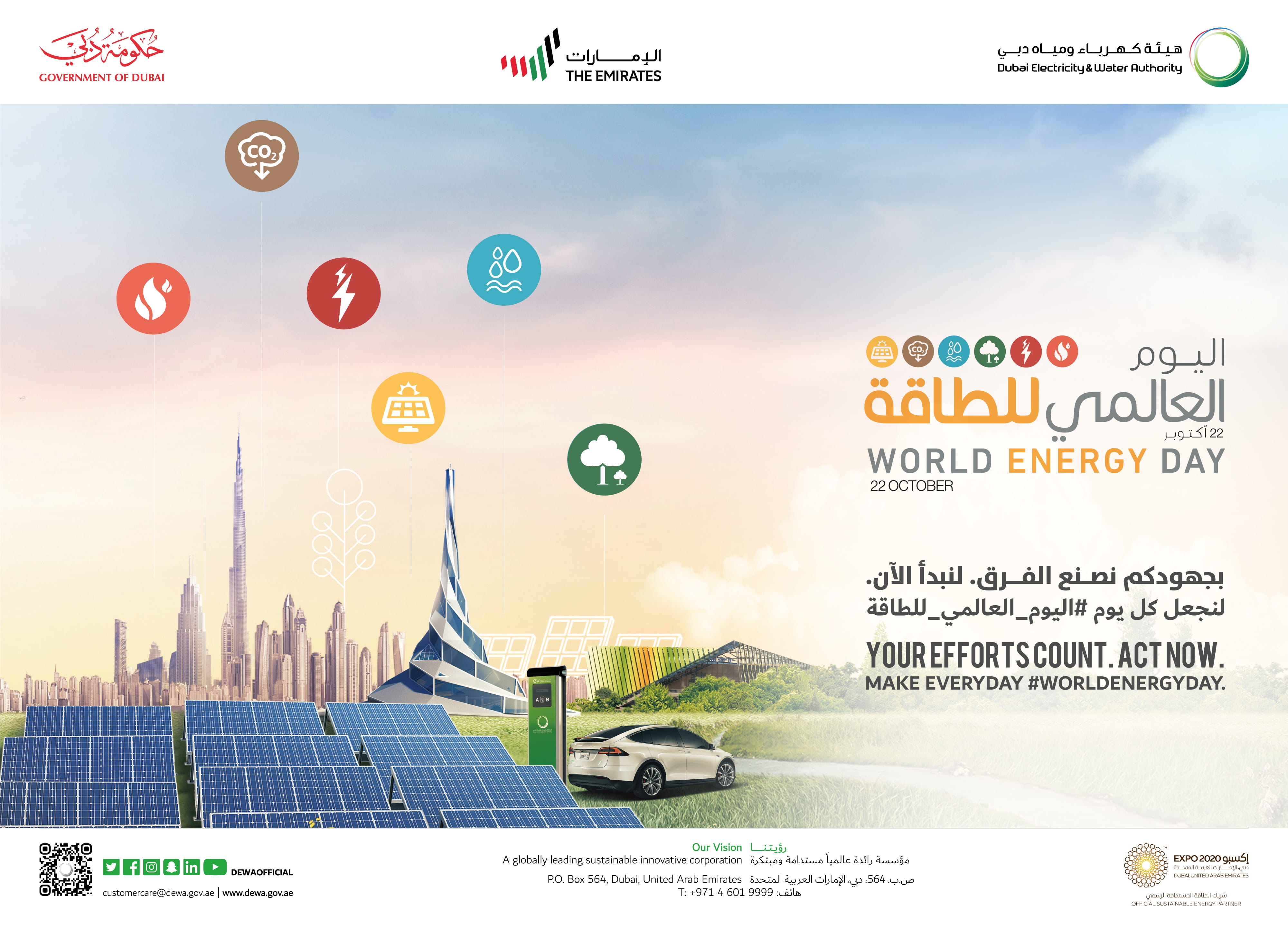 في إطار جهودها المتواصلة لإشراك الجمهور في تحقيق التنمية المستدامة، ورفع مستوى الوعي حول أهمية ترشيد الطاقة ورفع كفاءتها ودعم استدامتها، أطلقت هيئة كهرباء ومياه دبي حملة افتراضية بمناسبة اليوم العالمي للطاقة، الذي يصادف في 22 أكتوبر من كل سنة، وهي المبادرة التي اعتمدها صاحب السمو الشيخ محمد بن راشد آل مكتوم، نائب رئيس الدولة رئيس مجلس الوزراء حاكم دبي، رعاه الله، مع أربع وخمسين دولة من مختلف أنحاء العالم بالإضافة إلى ممثلي كل من الأمم المتحدة، وجامعة الدول العربية والاتحاد الإفريقي من خلال إعلان دبي في الثاني والعشرين من أكتوبر عام 2012.