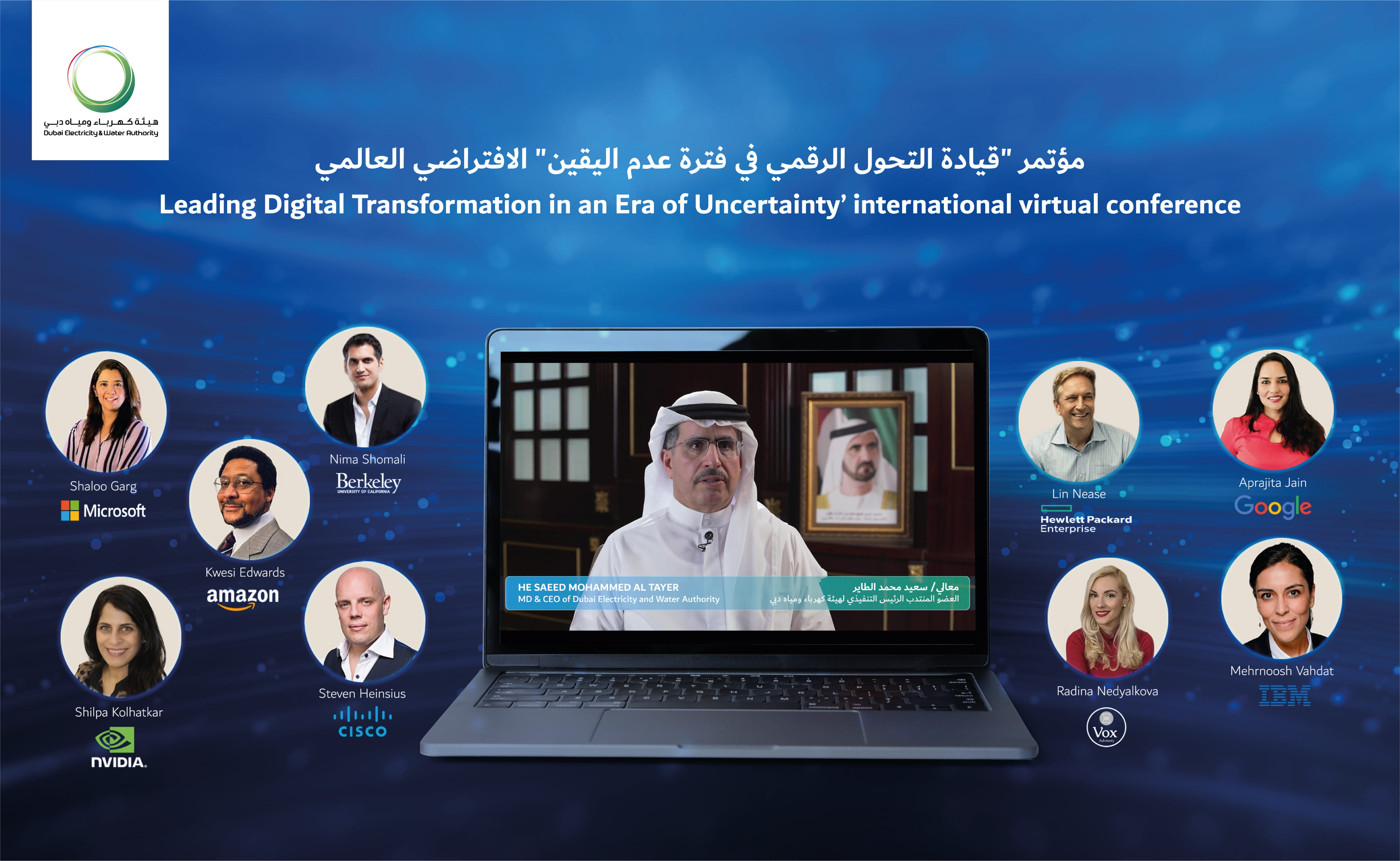 أكد معالي سعيد محمد الطاير، العضو المنتدب الرئيس التنفيذي لهيئة كهرباء ومياه دبي، أن جائحة كوفيد-19 دفعت بالمؤسسات حول العالم إلى التأقلم مع الوضع الجديد والتركيز على التحول الرقمي كأحد أهم التوجهات والأدوات لإدارة الأزمة الراهنة. جاء ذلك خلال الكلمة الافتتاحية التي ألقاها معاليه في مؤتمر "قيادة التحول الرقمي في فترة عدم اليقين" الافتراضي العالمي الذي بدأت فعالياته اليوم ويستمر حتى الخميس 27 مايو الجاري، ويضم متحدثين وخبراء من كبرى شركات التقنية العالمية وتشارك فيه الهيئة بصفتها الراعي الماسي.