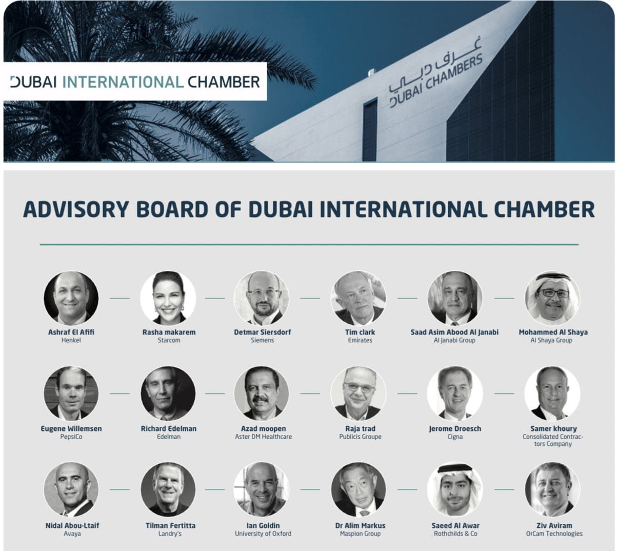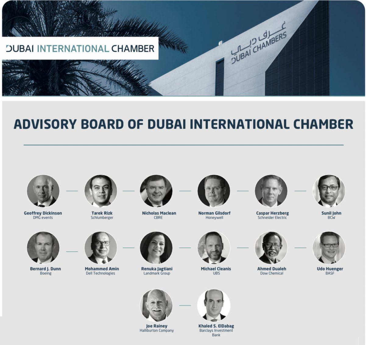كما يضم المجلس الاستشاري لغرفة دبي العالمية كلا من محمد الشايع، رئيس مجلس الإدارة التنفيذي في مجموعة الشايع، وسعد عاصم عبود الجنابي، رئيس مجموعة الجنابي، وتيم كلارك، رئيس طيران الامارات، وديتمار سيرسدورفر، العضو المنتدب لشركة سيمنز للطاقة في الشرق الأوسط والإمارات العربية المتحدة، ورشا مكارم، الرئيس التنفيذي الإقليمي لشركة ستاركوم في الشرق الأوسط وشمال إفريقيا، وأشرف العفيفي، رئيس هنكل في الهند والشرق الأوسط وأفريقيا، وسامر خوري، الرئيس التنفيذي لشركة اتحاد المقاولين، وجيروم دروش، الرئيس التنفيذي لشركة سيغنا في منطقة الشرق الأوسط وشمال إفريقيا، ورجا طراد، الرئيس التنفيذي، ببليسيز جروب الشرق الأوسط، وآزاد موبن، رئيس مجلس إدارة مجموعة أستر دي إم للرعاية الصحية، وريتشارد إيدلمان، الرئيس والمدير التنفيذي لشركة ايدلمان، ويوجين ويليمسن، الرئيس التنفيذي لشركة بيبسي كو في إفريقيا والشرق الأوسط وجنوب آسيا، وزيف أفيرام، المؤسس المشارك والرئيس التنفيذي المشارك لشركة اوركام تكنولوجيز، وسعيد منصور العور، الرئيس المشارك لمنطقة الشرق الأوسط ومدير مكتب الإمارات في بنك روتشايلد وشركاه، والدكتور عليم ماركوس، رئيس مجلس الإدارة والرئيس التنفيذي لمجموعة ماسبيون، وإيان جولدين، أستاذ العولمة والتنمية بجامعة أكسفورد، وتيلمان فيرتيتا، رئيس مجلس الإدارة والرئيس التنفيذي ومالك شركة لاندريز، ونضال رامز أبو لطيف، الرئيس العالمي لشركة افايا، وسونيل جون، رئيس شركة "بي سي دبليو" في الشرق الأوسط، وكاسبر هرزبرغ، رئيس شنايدر إلكتريك الشرق الأوسط وأفريقيا، ونورم جلزدورف، رئيس شركة هانيويل في روسيا وآسيا الوسطى والشرق الأوسط، ونيكولاس ماكلين، العضو المنتدب لشركة "سي بي ار اي" الشرق الأوسط، وطارق رزق، رئيس الشرق الأوسط وشمال أفريقيا في شركة شلمبرجير، وجيفري ديكنسون، الرئيس التنفيذي لشركة "دي ام جي ايفنتز"، وادو يونغر، نائب الرئيس لمنطقة الشرق الأوسط في شركة "بي ايه اس اف"، وأحمد دعالة، مدير عام في شركة داو للكيماويات، ومايكل كليانيس، العضو المنتدب ورئيس الخدمات المصرفية العالمية لمنطقة الشرق الأوسط وشمال إفريقيا في بنك يو بي اس، ورينوكا جاغتياني، رئيس مجلس الادارة والرئيس التنفيذي لمجموعة لاندمارك، ومحمد أمين، نائب أول للرئيس لمنطقة الشرق الأوسط وروسيا وأفريقيا وتركيا في شركة ديل، وبرنارد دن، رئيس بوينج الشرق الأوسط وتركيا وأفريقيا، وخالد الدباغ، رئيس الخدمات المصرفية لبنك "باركليز" في منطقة الشرق الأوسط وشمال أفريقيا، وجو ريني، رئيس نصف الكرة الشرقي في شركة هاليبيرتون.