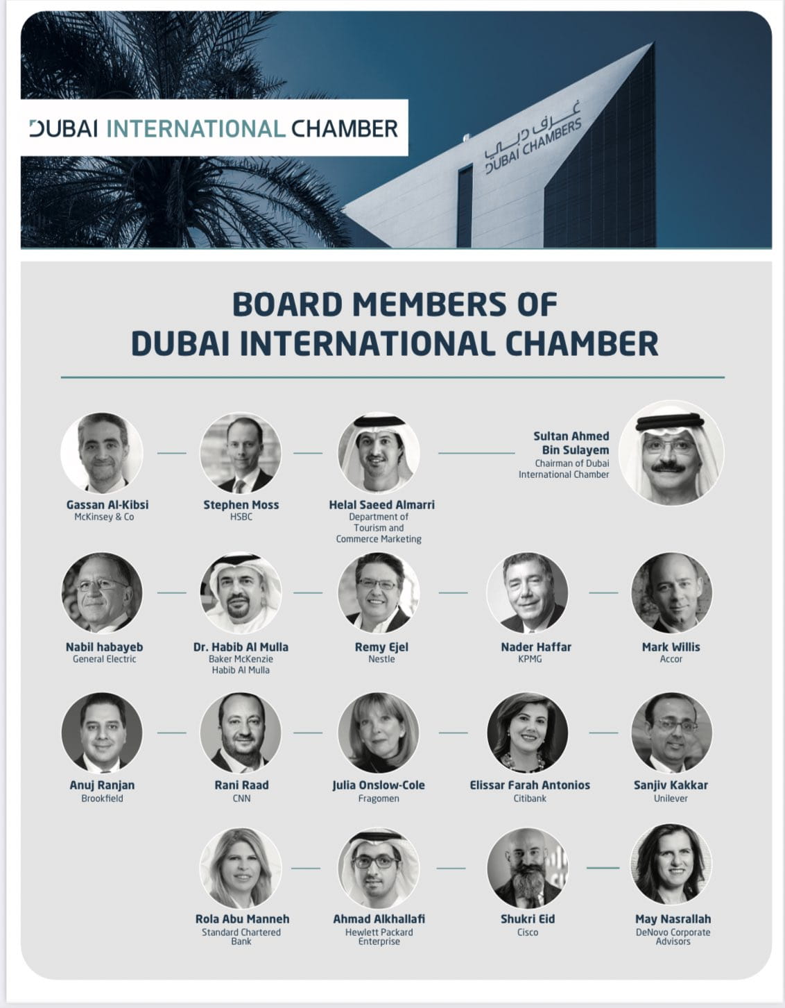 ويضم مجلس إدارة غرفة دبي العالمية سعادة سلطان أحمد بن سليم رئيس مجلس إدارة غرفة دبي العالمية، وعضوية كلٍ من هلال سعيد المرّي، مدير عام دائرة السياحة والتسويق التجاري، وستيفن موس، الرئيس التنفيذي الإقليمي لبنك HSBC في منطقة الشرق الاوسط وشمال افريقيا وتركيا، وغسان الكبسي، الشريك الإداري لمنطقة الشرق الأوسط في ماكنزي، ومارك ويليس، الرئيس التنفيذي لمنطقة الشرق الأوسط وأفريقيا في اكور للضيافة، ونادر حفّار، الرئيس التنفيذي لشركة كي بي ام جي لوار جلف ليمتد التابعة لشركة كي بي ام جي، و ريمي إيجل، رئيس مجلس الإدارة والرئيس التنفيذي لمنطقة الشرق الأوسط وشمال إفريقيا في نستله، والدكتور حبيب الملّا، رئيس مجلس إدارة تنفيذي لشركة بيكر آند ميكنزي حبيب الملا، ونبيل حبايب، نائب الرئيس الأول والرئيس والمدير التنفيذي للأسواق الدولية في شركة جنرال إلكتريك الشرق الأوسط وشمال أفريقيا، وسانجيف كاكار، نائب الرئيس التنفيذي لشركة يونيليفر بالشرق الأوسط و شمال أفريقيا وتركيا وروسيا وبيلاروسيا و أوكرانيا، وإليسار فرح أنطونيوس، رئيس مجموعة الشرق الأوسط وشمال أفريقيا، والرئيس التنفيذي - الإمارات في مجموعة سيتي المصرفية، وجوليا أونسلو-كول، شريك الاستراتيجيات الحكومية العالمية والامتثال في فراغومين، وراني رمزي رعد، رئيس السي ان ان للعمليات التجارية العالمية، وأنوج رانجان، الشريك الإداري والرئيس التنفيذي لجنوب آسيا والشرق الأوسط في شركة بروكفيلد، ومي نصرالله ميرفيل، المؤسس والرئيس التنفيذي لـ"شركة دينوفو لاستشارات الشركات، وشكري عيد، العضو المنتدب لمنطقة الخليج بشركة سيسكو، وأحمد الخلافي، مدير عام هيوليت باكارد إنتربرايز- الإمارات، و رولا أبو منه، الرئيس التنفيذي لبنك ستاندرد تشارترد الإمارات.