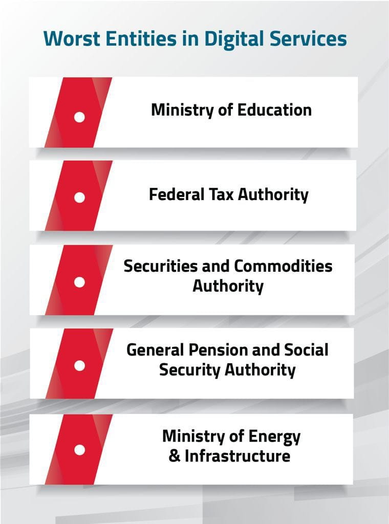 أما قائمة أسوأ الجهات في الخدمات الرقمية فضمت وزارة التربية والتعليم، والهيئة الاتحادية للضرائب، وهيئة الأوراق المالية والسلع، والهيئة العامة للمعاشات والتأمينات الاجتماعية، ووزارة الطاقة والبنية التحتية.