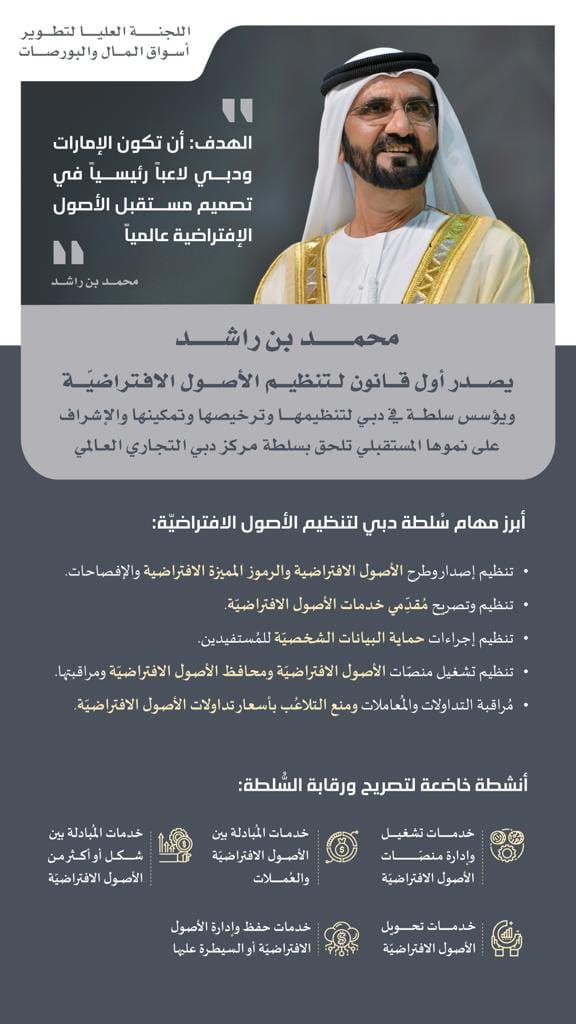 أصدر صاحب السمو الشيخ محمد بن راشد آل مكتوم، نائب رئيس الدولة رئيس مجلس الوزراء، "رعاه الله"، بصفته حاكماً لإمارة دبي، أول قانون من نوعه لتنظيم الأصول الافتراضيّة الهادف إلى الارتقاء بمكانة دبي والإمارات كوجهة إقليميّة وعالميّة في مجال الأصول الافتراضيّة، وتوفير النُّظم اللازمة لحماية المُستثمِرين والمُتعامِلين في هذا القطاع والإسهام في جذب الاستثمارات والشّركات العاملة في هذا المجال لتتّخذ من الإمارة مركزاً لأعمالِها.