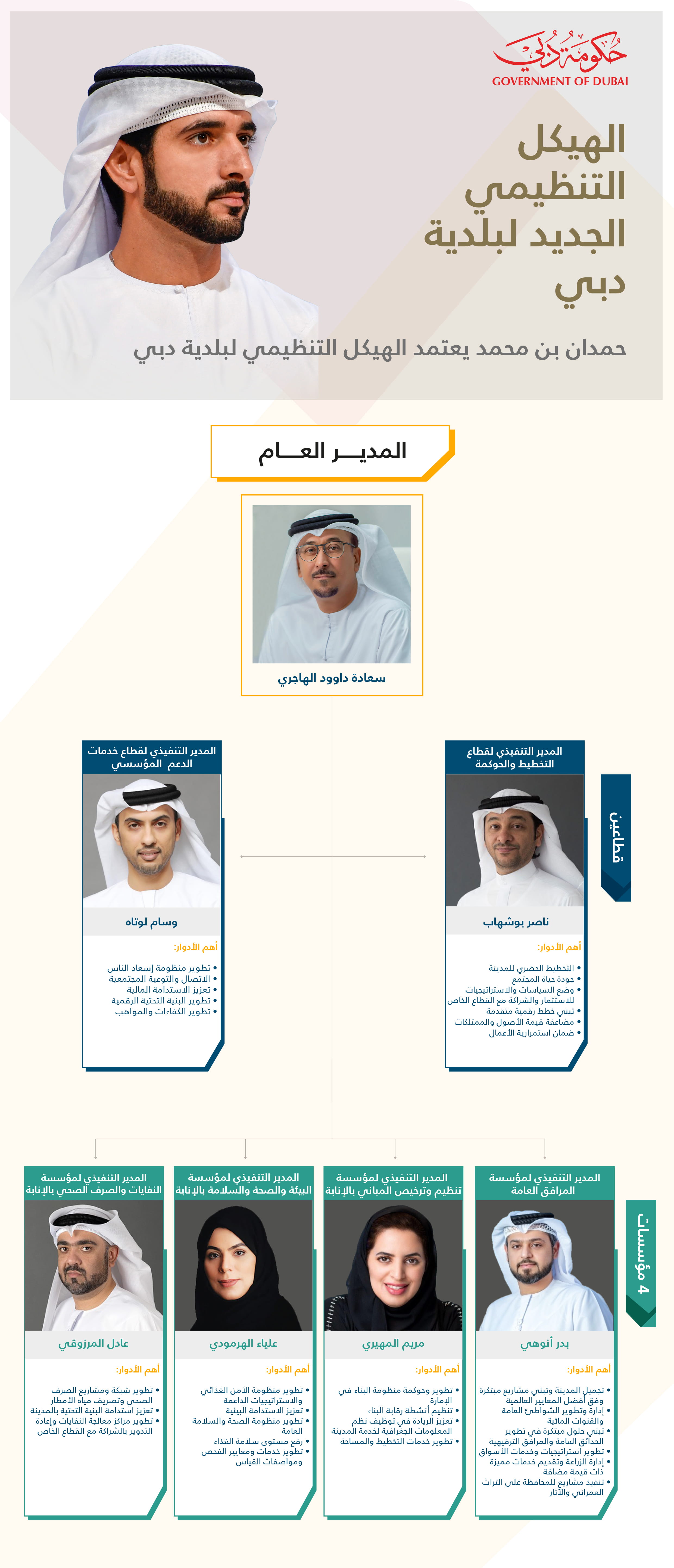 وسيضم الهيكل التنظيمي الجديد لبلدية دبي قطاعين رئيسين وهما قطاع التخطيط والحوكمة، وقطاع خدمات الدعم المؤسسي، إضافة إلى 4 مؤسسات جديدة تعمل تحت إشراف وإدارة البلدية وتشمل مؤسسة تنظيم وترخيص المباني، ومؤسسة البيئة والصحة والسلامة، ومؤسسة المرافق العامة، ومؤسسة النفايات والصرف الصحي.