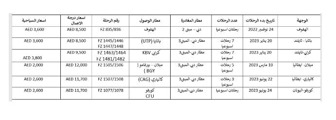 أعلنت فلاي دبي عن إطلاق رحلاتها إلى ست وجهات جديدة شملت ميلانو وكالياري في ايطاليا وكورفو في اليونان وكرابي وباتايا في تايلند اعتبارا من العام المقبل 2023 بالإضافة إلى استئناف الرحلات إلى الهفوف اعتبارا من 24 نوفمبر