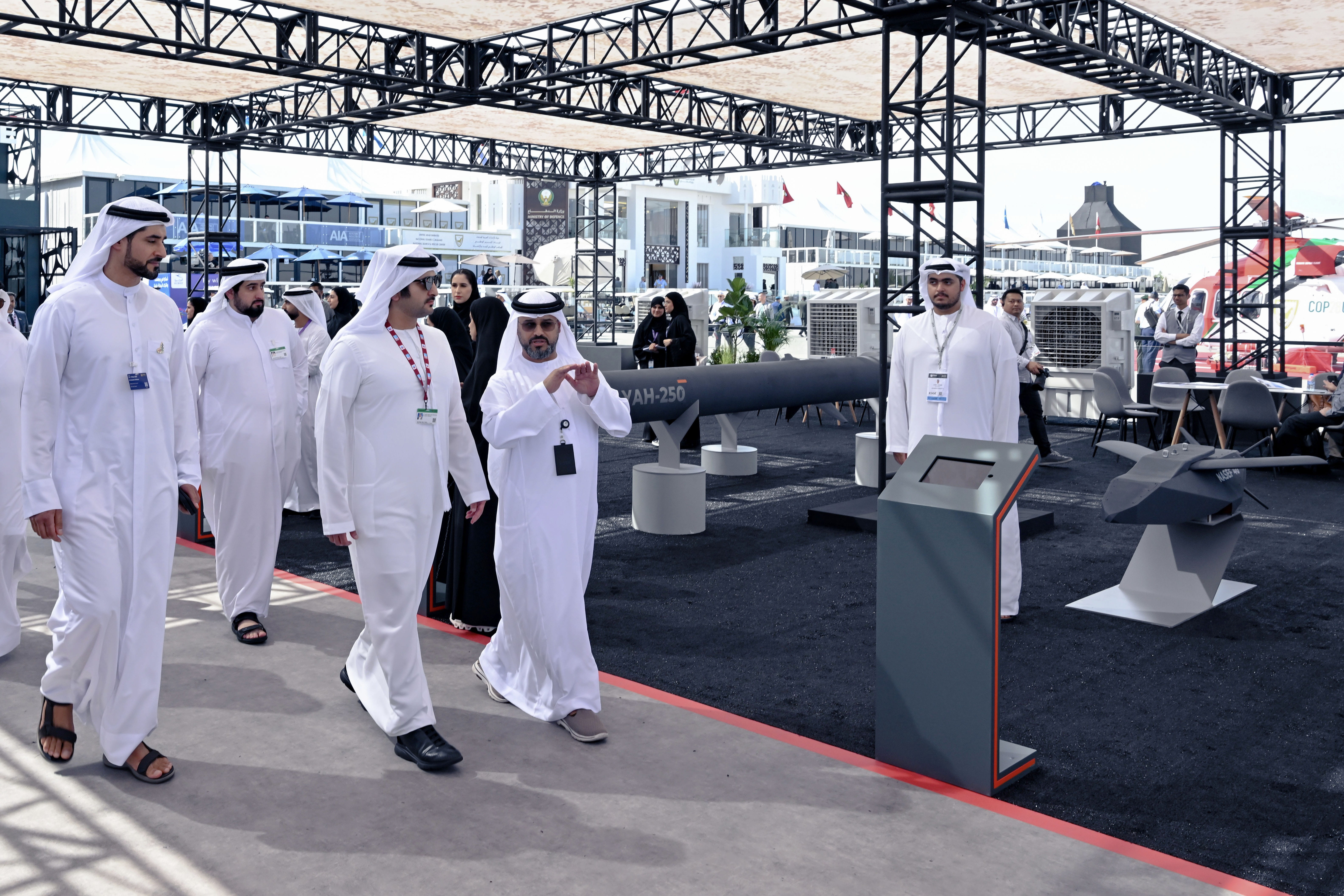 وشملت الزيارة تفقد الطائرة الهليكوبتر التابعة للمركز الوطني للبحث والإنقاذ، والتي تتميز بقدرتها على العمل وإنجاز عمليات الإنقاذ في مختلف الأجواء والأوقات، فضلا عن تمتعها بإمكانية الرؤية الليلية والبحث الضوئي والتحليق والطفو فوق المياه، كما أنها مجهزة بمعدات وتجهيزات طبية ومكبرات صوت. كما تضمنت الجولة تفقّد الطائرة الهندية المقاتلة "تيجاس هال" وهي مقاتلة خفيفة متعددة المهام، والتي تتميز بتصميم جناحها على شكل مثلث دلتا مدعوم من محرك واحد. كما شملت الجولة التوقف عند طائرة قامت بتصنيعها شركة "بيوند" التي تتخذ من جزر المالديف مقرا لها والتي تتيح تجربة السفر الترفيهي الفاخرة مع مساحة إضافية مريحة وأحدث التقنيات الداخلية لضمان حصول المسافر على أفضل تجربة سفر.