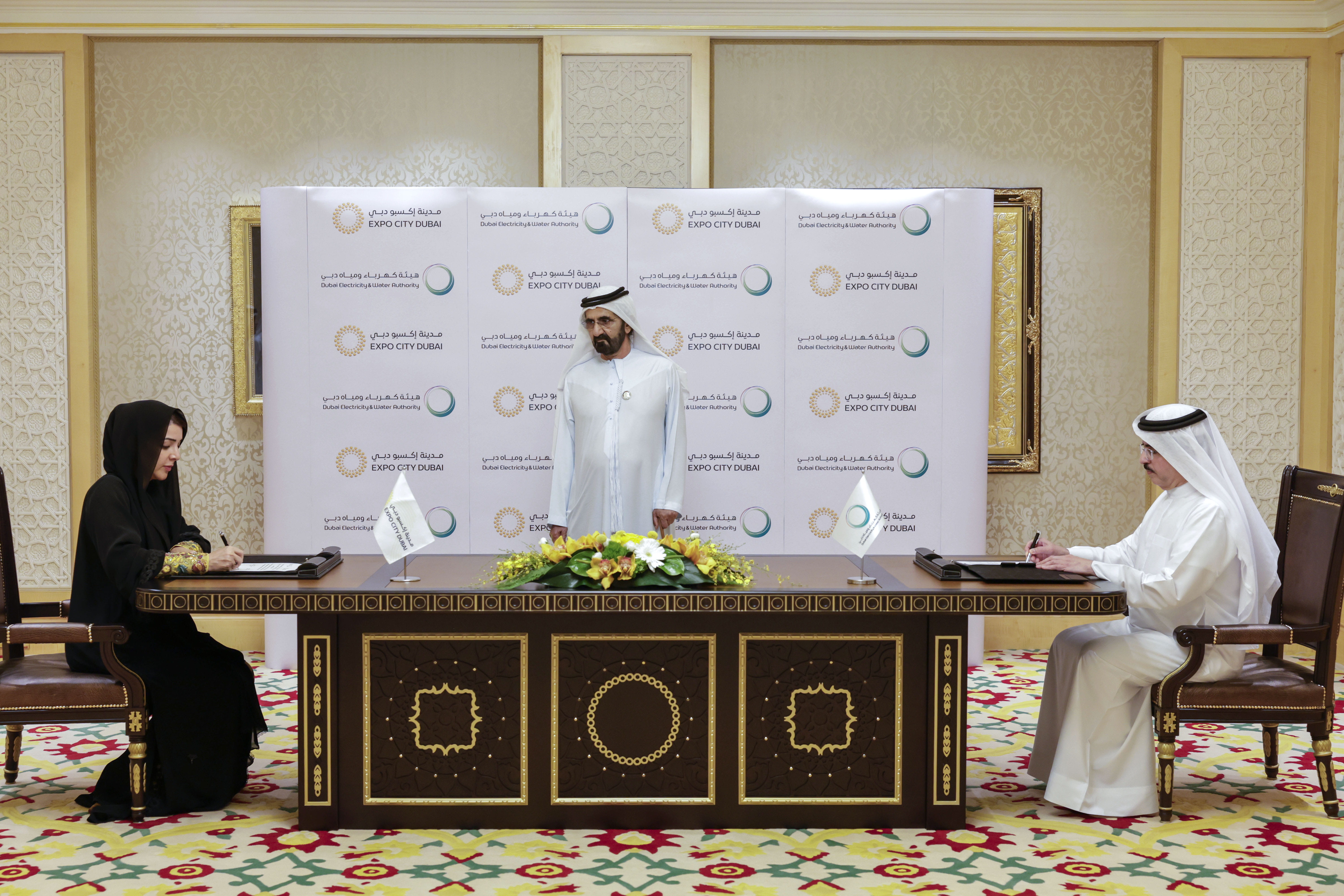 شهد صاحب السمو الشيخ محمد بن راشد آل مكتوم، نائب رئيس الدولة رئيس مجلس الوزراء حاكم دبي، رعاه الله، بحضور سمو الشيخ حمدان بن محمد بن راشد آل مكتوم، ولي عهد دبي رئيس المجلس التنفيذي لإمارة دبي، توقيع اتفاقية تعاون بين مدينة إكسبو دبي وهيئة كهرباء ومياه دبي، اليوم (الثلاثاء) لتزويد مدينة إكسبو دبي بالكامل بالكهرباء المولدة من الطاقة المتجددة، وذلك ضمن رحلتها نحو الحياد المناخي بحلول عام 2050.
