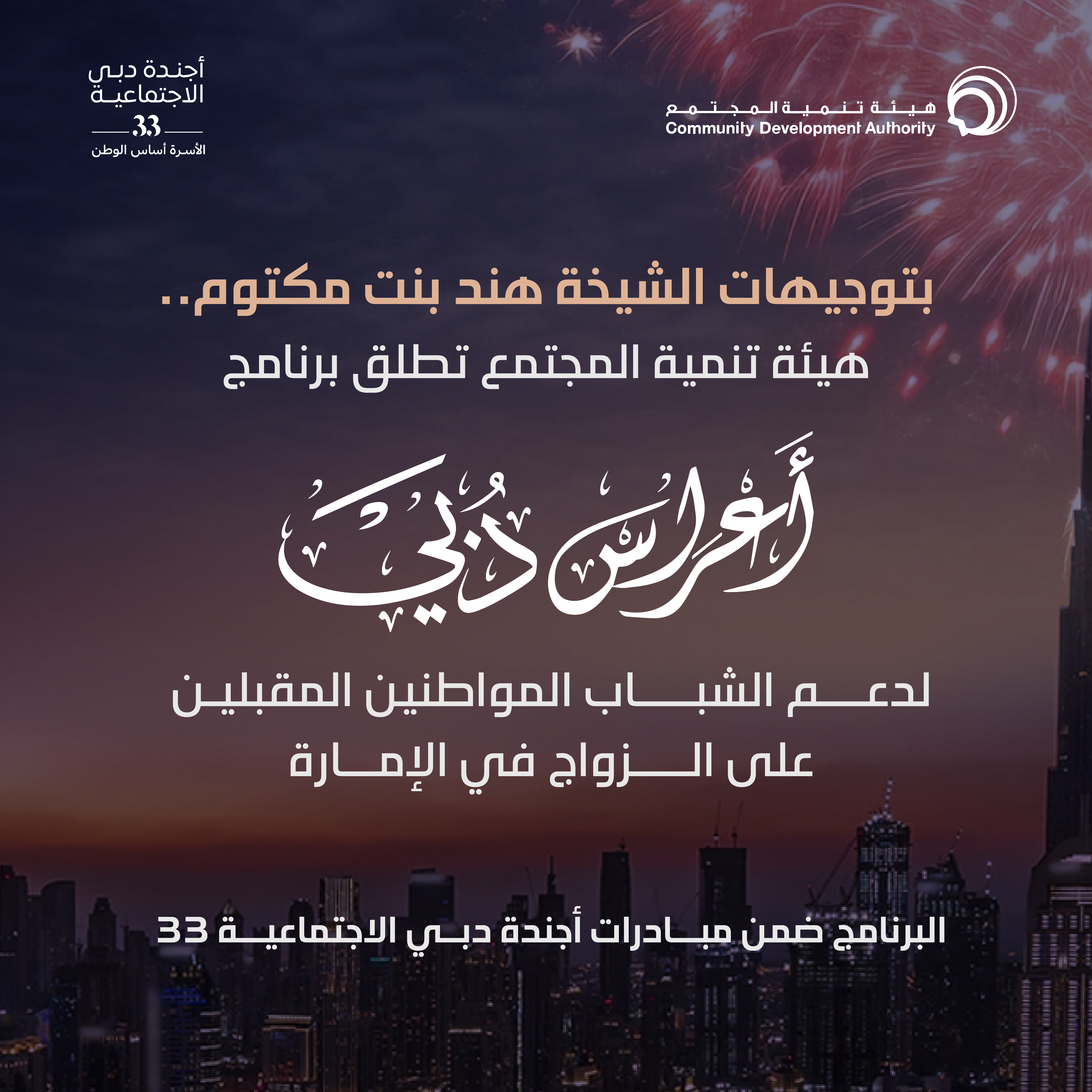 ترجمة لرؤى صاحب السمو الشيخ محمد بن راشد آل مكتوم، نائب رئيس الدولة رئيس مجلس الوزراء حاكم دبي، رعاه الله، وبتوجيهات من حرم سموه، سموّ الشيخة هند بنت مكتوم بن جمعة آل مكتوم، وضمن مبادرات أجندة دبي الاجتماعية 33 "الأسرة أساس الوطن"، أطلقت هيئة تنمية المجتمع في دبي اليوم، برنامج "أعراس دبي"، بهدف توفير الدعم للمقبلين على الزواج من المواطنين في دبي، وتخفيف الأعباء المالية عنهم، بما يشجّعهم على الزواج، ويسهم في تعزيز الاستقرار الأسري.