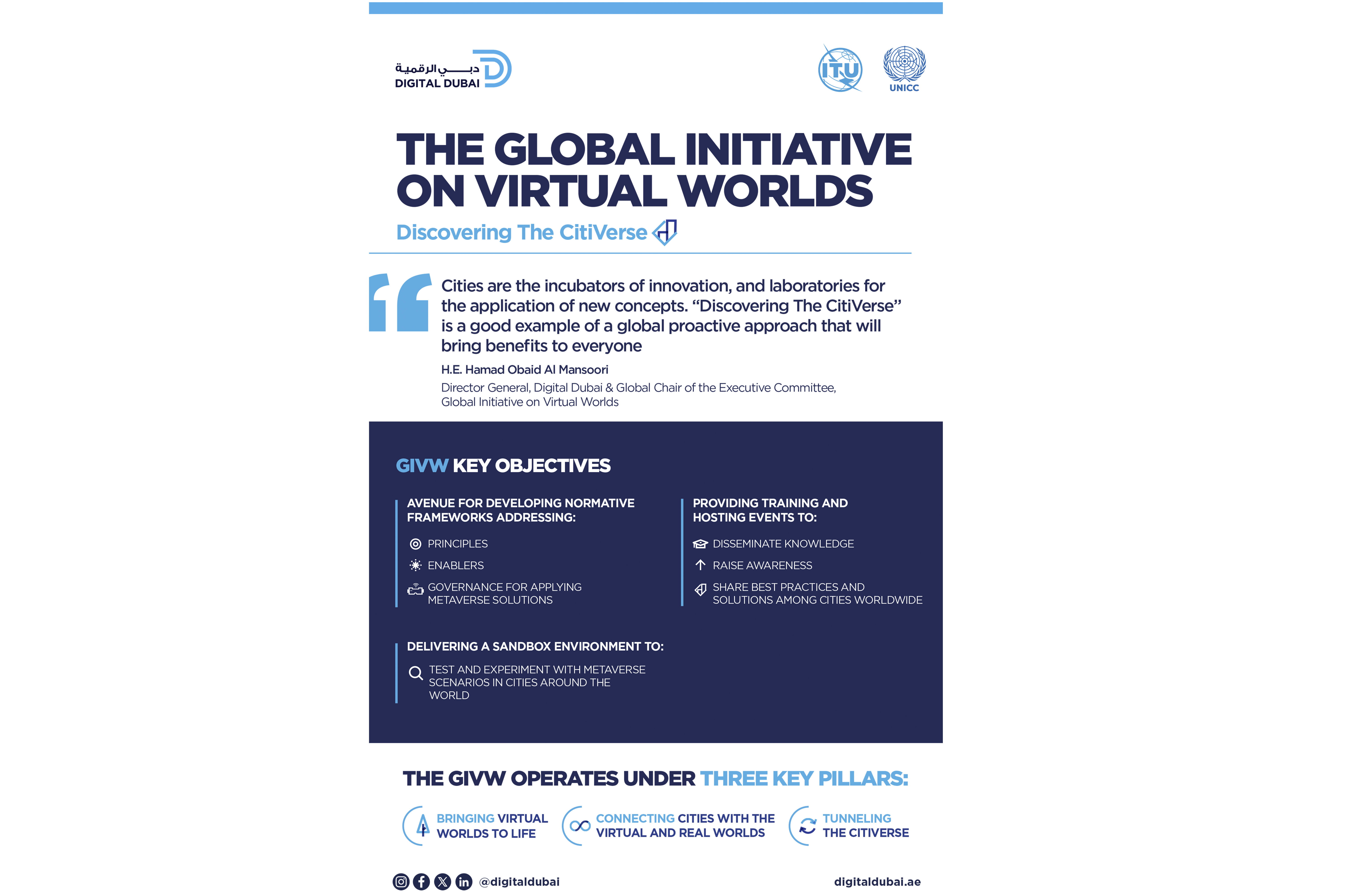 أعلنت كل من دبي الرقمية، والاتحاد الدولي للاتصالات، ومركز الحوسبة الدولي التابع للأمم المتحدة اليوم عن إطلاق مبادرة عالمية مشتركة تخص العالم الافتراضي وتحمل عنوان "استكشاف المدن الافتراضية". وقد جاء الإعلان عن هذه المبادرة خلال حفل خاص أقيم في مقر الاتحاد الدولي للاتصالات في مدينة جنيف السويسرية، تزامناً مع يوم الأمم المتحدة الافتراضي العالمي الذي أقرته المنظمة الدولية بهدف اكتشاف وتعزيز أثر التقنيات الافتراضية في تحقيق أهداف الأمم المتحدة للتنمية المستدامة.
