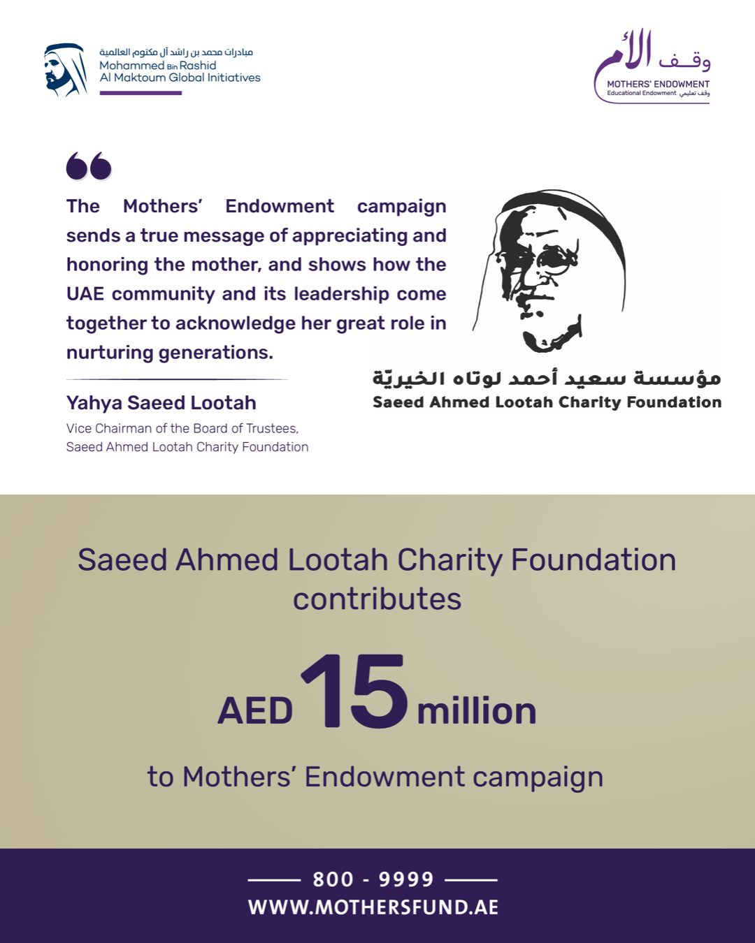 أعلنت مؤسسة سعيد أحمد لوتاه الخيرية عن تبرعها بمبلغ 15 مليون درهم لدعم حملة "وقف الأم" التي أطلقها صاحب السمو الشيخ محمد بن راشد آل مكتوم نائب رئيس الدولة رئيس مجلس الوزراء حاكم دبي "رعاه الله" تزامناً مع شهر رمضان المبارك، بهدف تكريم الأمهات من خلال إنشاء صندوق وقفي بقيمة مليار درهم لدعم تعليم ملايين الأفراد حول العالم.