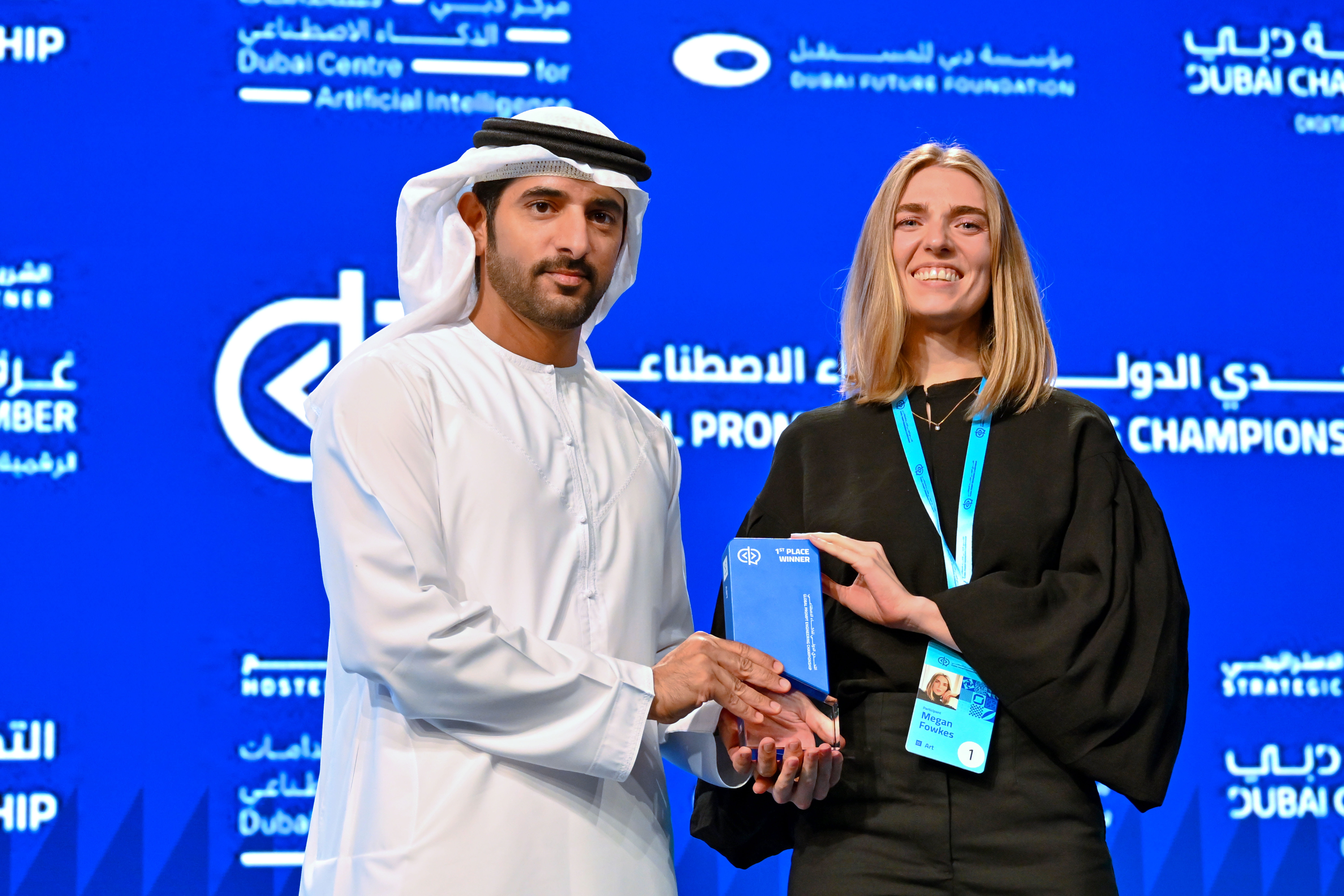وكرم سموه بحضور سمو الشيخة لطيفة بنت محمد بن راشد آل مكتوم، رئيسة هيئة الثقافة والفنون في دبي عضو مجلس دبي، الفائزين بالتحدي وهم آجاي سيريل من الهند في فئة البرمجة، وميغان فوكس من النمسا في فئة الفن، وأديتيا ناير من الهند في فئة الأدب.