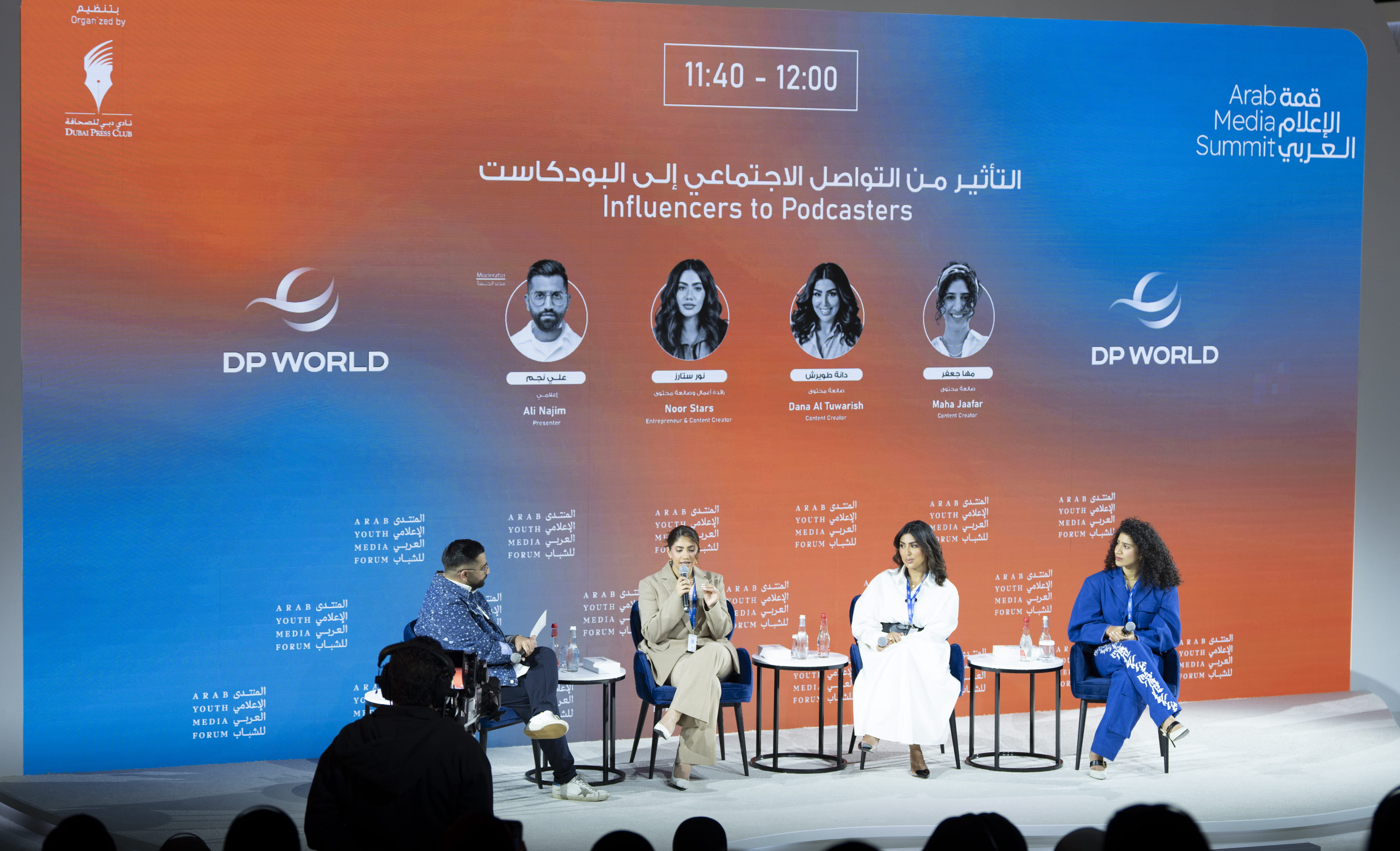 واستضافت الجلسة التي أدارها الإعلامي علي نجم ضمن برنامج "دردشات إعلامية" مجموعة من صانعات المحتوى المتميزات في العالم العربي وهن: الطبيبة مها جعفر، ودانة طويرش، ونور ستارز، حول أسباب التوجه للبودكاست كوسيلة إعلامية جديدة لتوصيل رسالتهن.