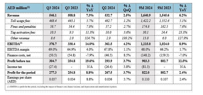 الأداء القوي المستمر أدى لارتفاع إيرادات سالك إلى 1,640.9 مليون درهم خلال الأشهر التسعة الأولى من عام 2024، بزيادة قدرها 6.2% على أساس سنوي