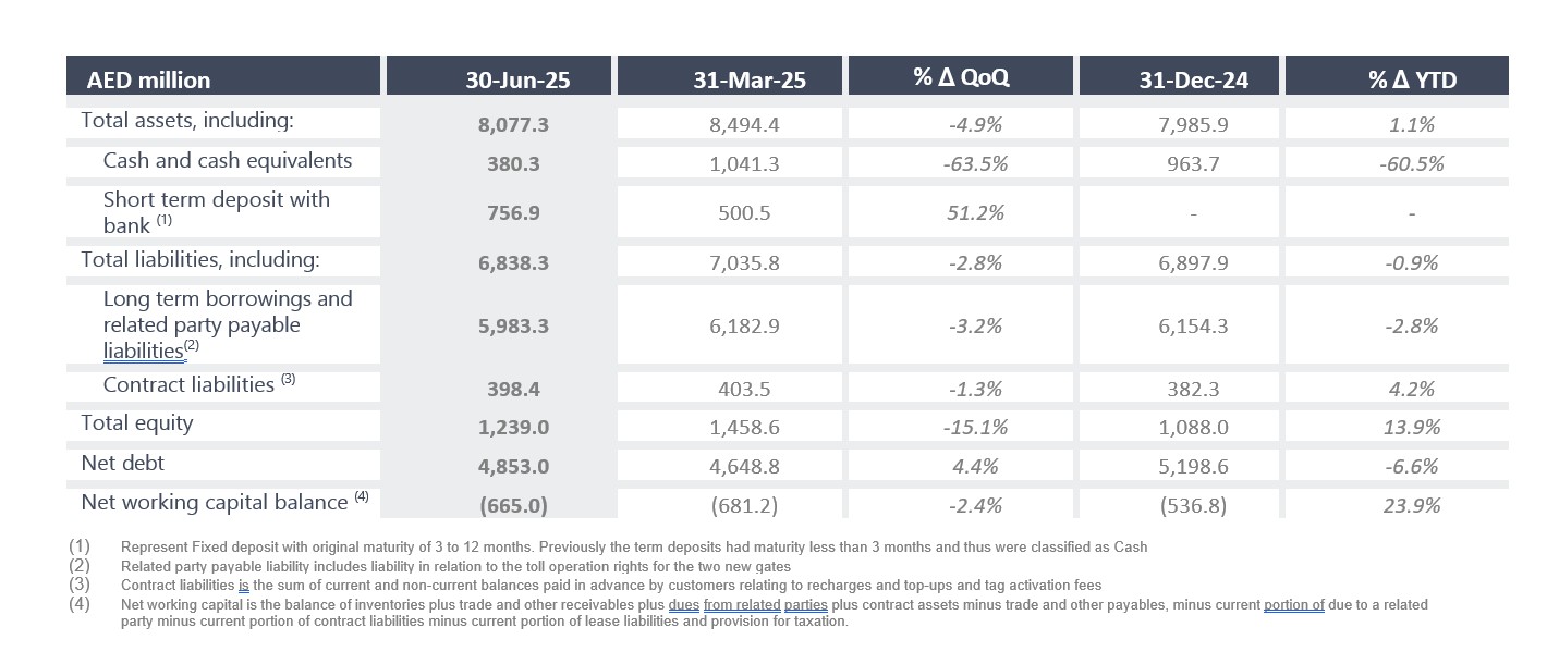 سجلت الشركة صافي رصيد رأس مال عامل بمستوى قدره-665.0 مليون درهم كما في 30 يونيو 2025، أي ما يعادل 21.8% كنسبة مئوية من الإيرادات السنوية، وذلك بما يتماشى بشكل عام مع المستويات المسجلة في الربع الأول من 2025. وتأتي الزيادة في صافي رأس المال العامل في عام 2025 مقارنة بالفترات السابقة مدفوعةً بالدفعات نصف السنوية الخاصة بحقوق امتياز البوابات الجديدة مع هيئة الطرق والمواصلات بالإضافة الى مخصصات ضريبة الشركات. وحتى تاريخ 30 يونيو 2025، بلغ صافي الدين 4.853.0 مليون درهم، بزيادة قدرها 4.4% عن 4,648.8 مليون درهم في نهاية الربع الأول من 2025. وبذلك تصل نسبة صافي الدين إلى الأرباح قبل احتساب تكاليف التمويل والضرائب والاستهلاك والإطفاء في الربع الثاني من عام 2025 إلى 2.55 ضعفاً على مدار اثني عشر شهراً متتالية، وهو ما يعد تحسناً بالمقارنة مع 2.7 ضعفاً المسجلة في نهاية الربع الأول من عام 2025، وأقل بكثير من الحد الأقصى للاستدانة البالغ 5 أضعاف.