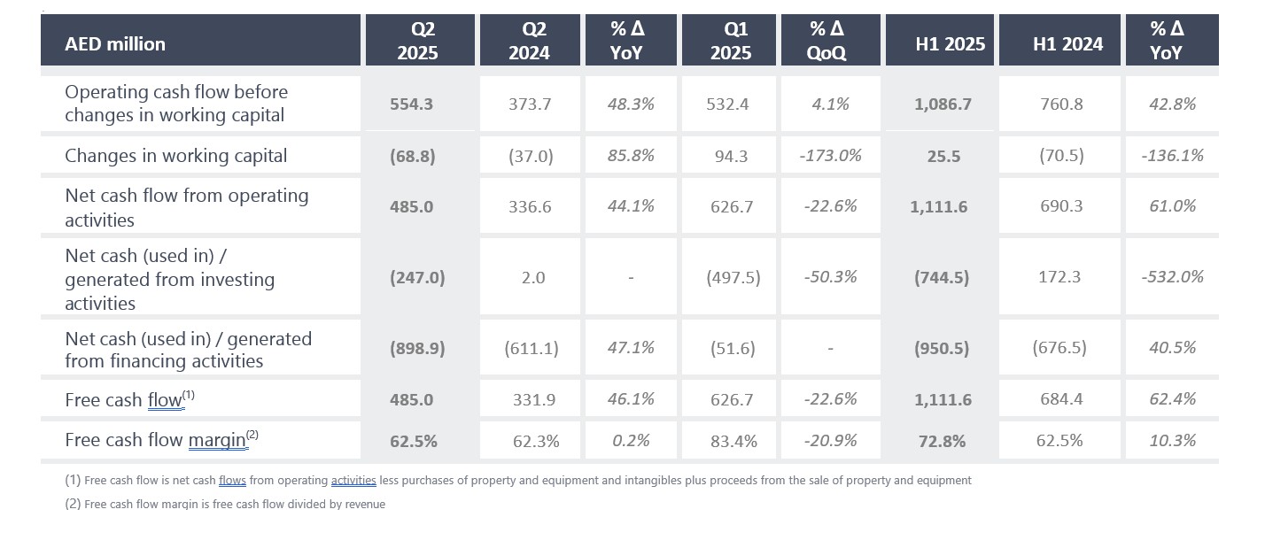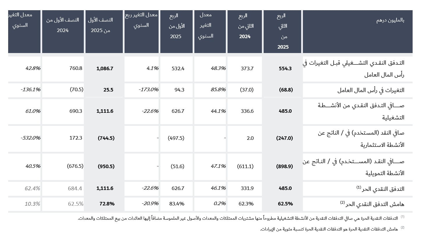 موجز التدفقات النقدية: تدفق نقدي حر بقيمة 1,111.6 مليون درهم وهامش 72.8% في النصف الأول من عام 2025