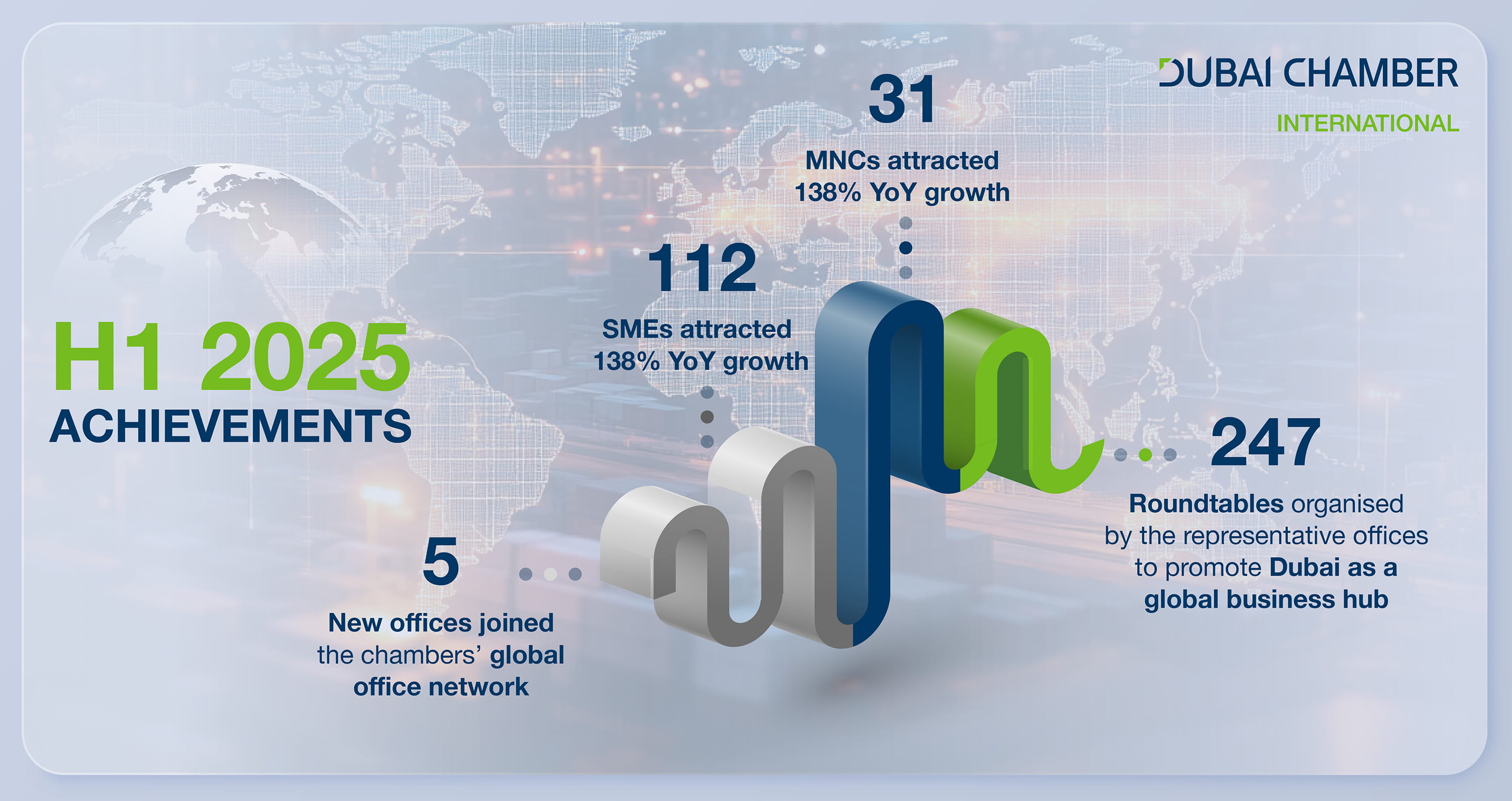 وفي إطار الالتزام بتحقيق مستهدفات مبادرة "دبي جلوبال" الرامية إلى إطلاق 50 مكتباً تمثيلياً حول العالم بحلول عام 2030 لتعزيز دور دبي كمركز عالمي رائد للأعمال، وجذب الاستثمار الأجنبي المباشر إلى الإمارة، ودعم توسع شركات دبي في 30 سوقاً ذات أولوية على مستوى العالم، قامت غرفة دبي العالمية خلال النصف الأول من العام الجاري بتعزيز حضورها العالمي من خلال افتتاح 5 مكاتب تمثيلية جديدة في كل من دكا في بنغلاديش، وكيب تاون في جنوب أفريقيا، وبنغالور في الهند، وبانكوك في تايلاند، وتورنتو في كندا.