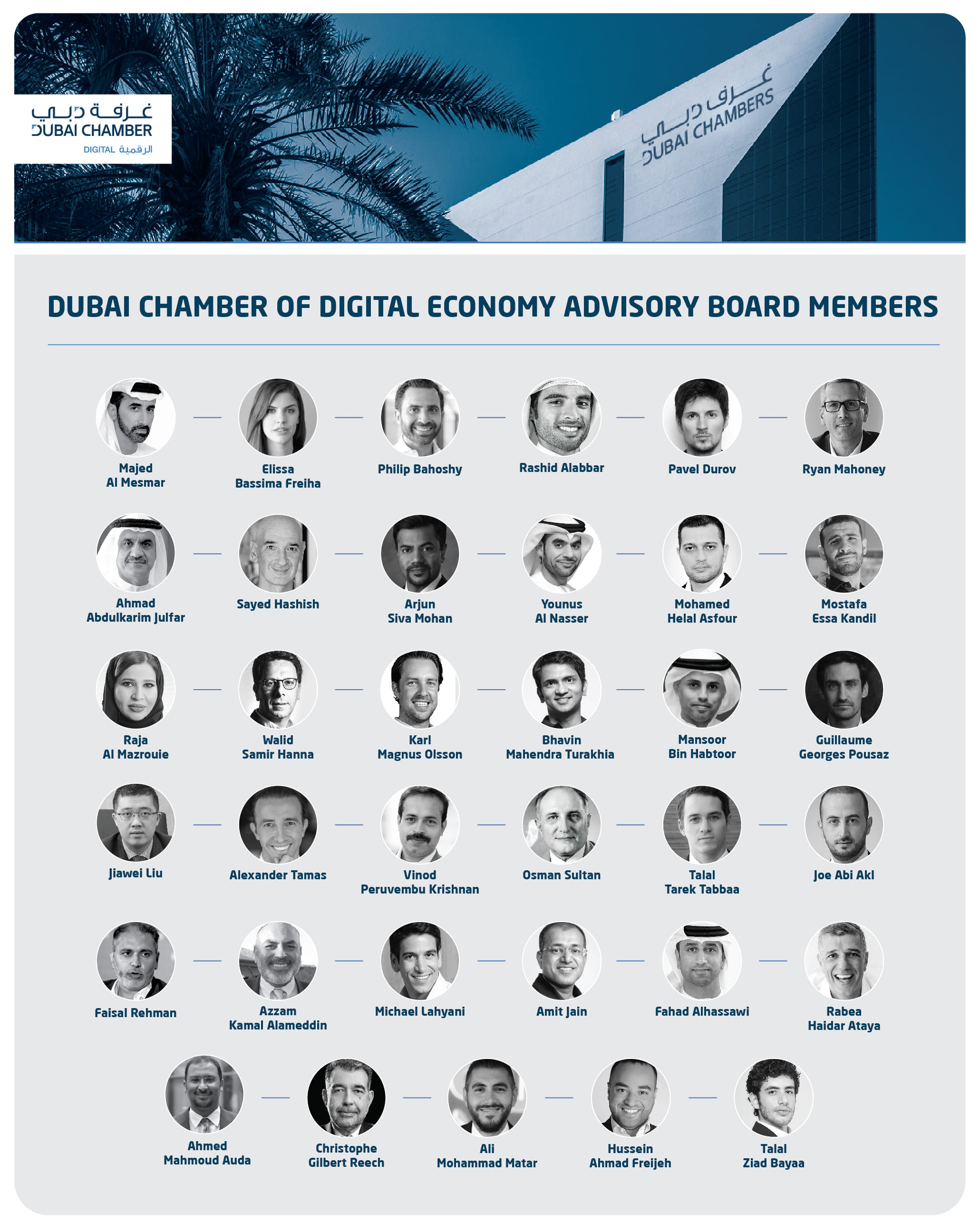 كما يشمل المجلس الاستشاري لغرفة دبي للاقتصاد الرقمي كلاً من ريان ماهوني، وبافل دوروف، وراشد محمد العبار، وفيليب بحوشي، واليسا فريحة، وماجد المسمار، ومصطفى قنديل، ومحمد هلال عصفور، ويونس آل ناصر، وارجون موهان، وسيد حشيش، وأحمد عبد الكريم جلفار، وجويلام جيورجس بويساز، ومنصور بن حبتور، وبهافين ماهيندرا توراخيا، وكارل ماجنوس اولسون، ووليد سمير حنا، ورجاء المزروعي، وجو ابی عقل، وطلال طارق الطباع، وعثمان سلطان، وفينود بيروفيمبو كريشنان، والكسندر تاماس، وجياوي ليو، وربيع حيدر عطايا، وفهد الحساوي، وأميت جاين، ومايكل لهياني، وعزام علم الدين، وفيصل رحمن، وطلال زياد بايا، وحسين أحمد فريجة، وعلي محمد مطر، وكريستوف جيلبيرت ريج، وأحمد محمود عودة.