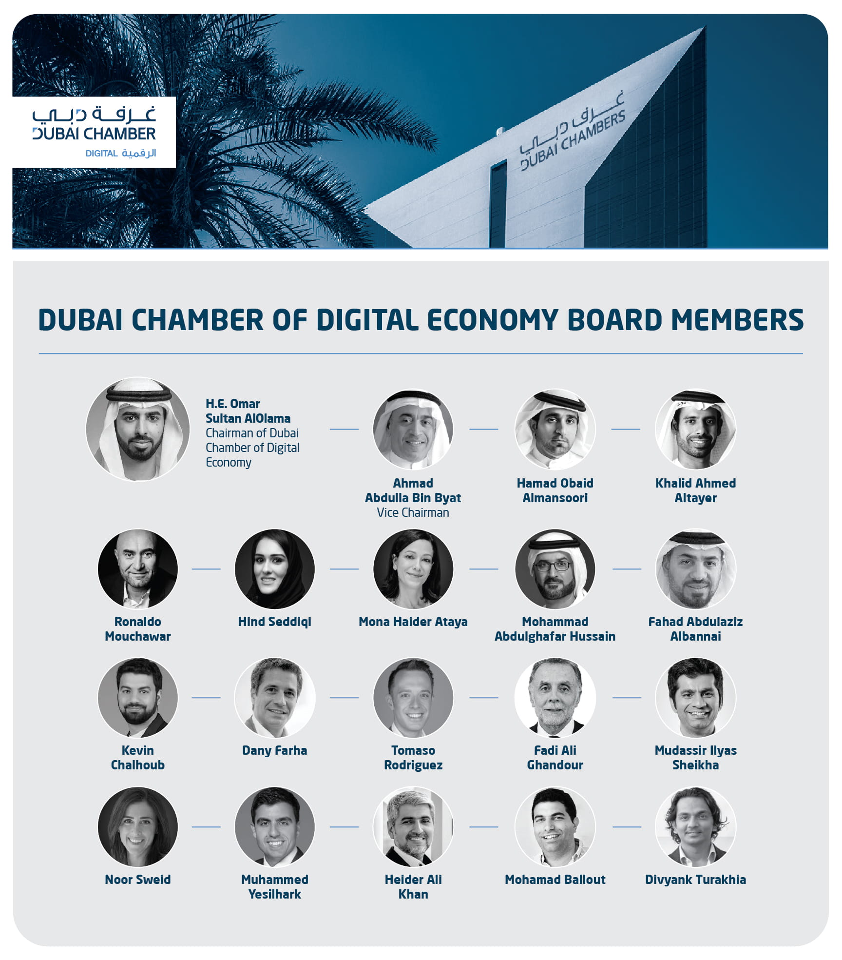ويشمل مجلس إدارة غرفة دبي للاقتصاد الرقمي معالي عمر سلطان العلماء، رئيساً لمجلس إدارة الغرفة، وعضوية كل من أحمد عبدالله بن بيات نائباً للرئيس، وحمد عبيد المنصوري، وفهد عبدالعزيز البناي، ومحمد عبدالغفار حسين، وخالد أحمد الطاير، وفادي غندور، ومنى حيدر عطايا، وهند عبدالحميد صديقي، ورونالدو مشحور، وتوماسو رودريجز، وكيفن شلهوب، ونور سويد، وديفيانك توراخيا، ومدثر شيخة، وداني فرحة، ومحمد بلوط، وحيدر علي خان، ومحمد يسيلهارك.