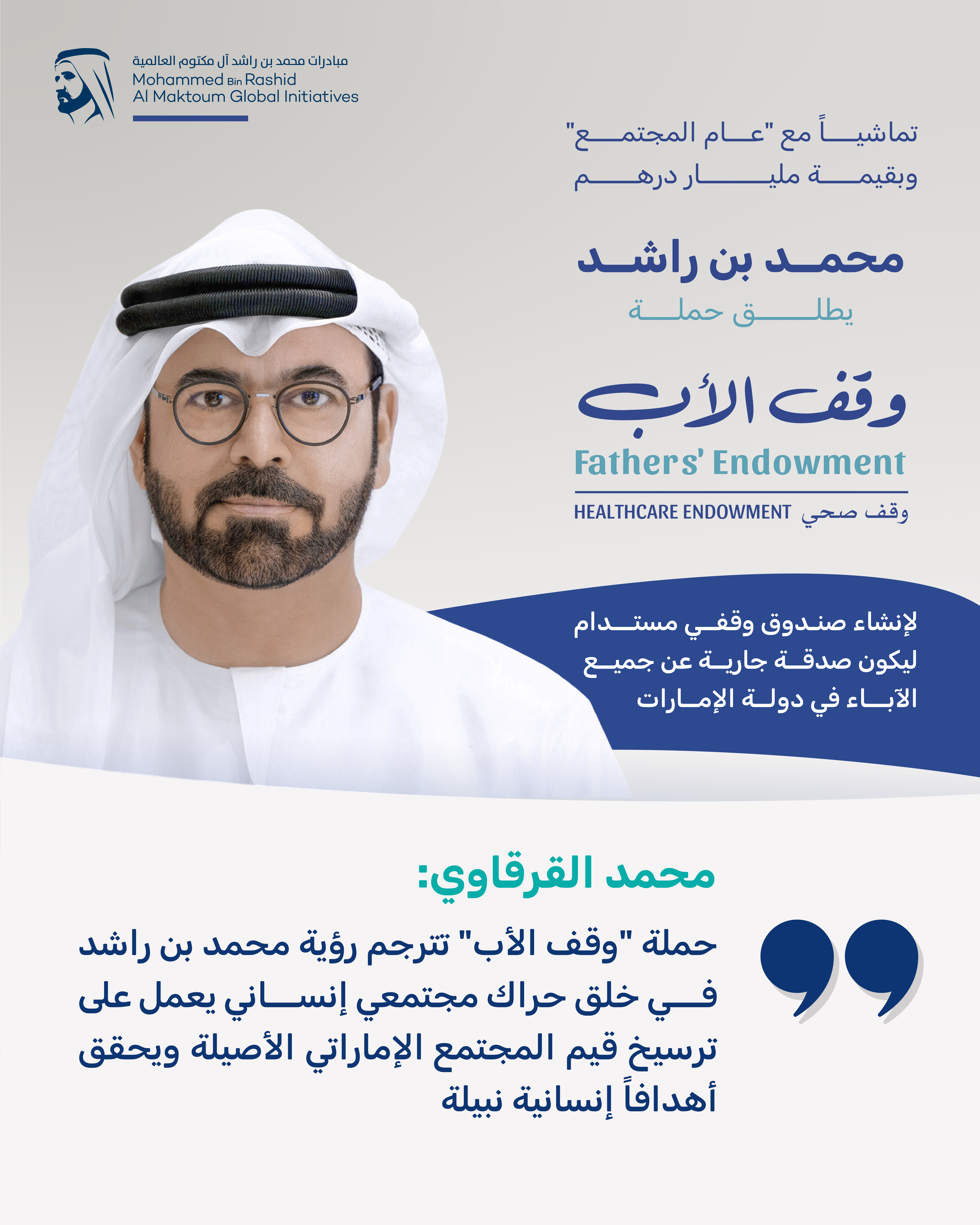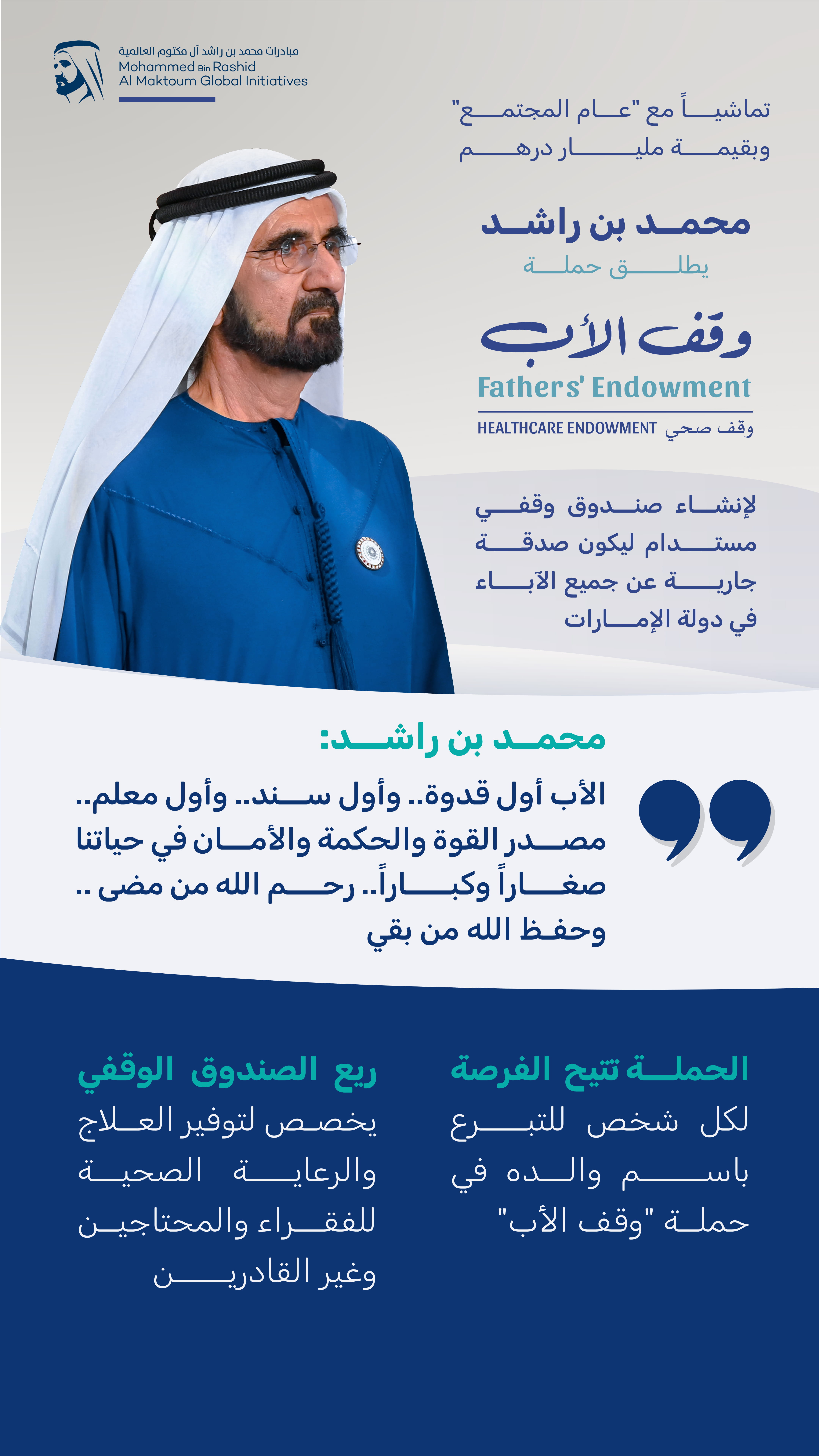 تماشياً مع إعلان صاحب السمو الشيخ محمد بن زايد آل نهيان رئيس الدولة، "حفظه الله"، تخصيص عام 2025 ليكون "عام المجتمع" في دولة الإمارات تحت شعار "يداً بيد" في مبادرة وطنية تجسد رؤية القيادة تجاه بناء مجتمع متماسك ومزدهر.. أطلق صاحب السمو الشيخ محمد بن راشد آل مكتوم، نائب رئيس الدولة رئيس مجلس الوزراء حاكم دبي "رعاه الله"، حملة "وقف الأب" بهدف تكريم الآباء في دولة الإمارات من خلال إنشاء صندوق وقفي مستدام بقيمة مليار درهم، يخصص ريعه لتوفير العلاج والرعاية الصحية للفقراء والمحتاجين وغير القادرين.