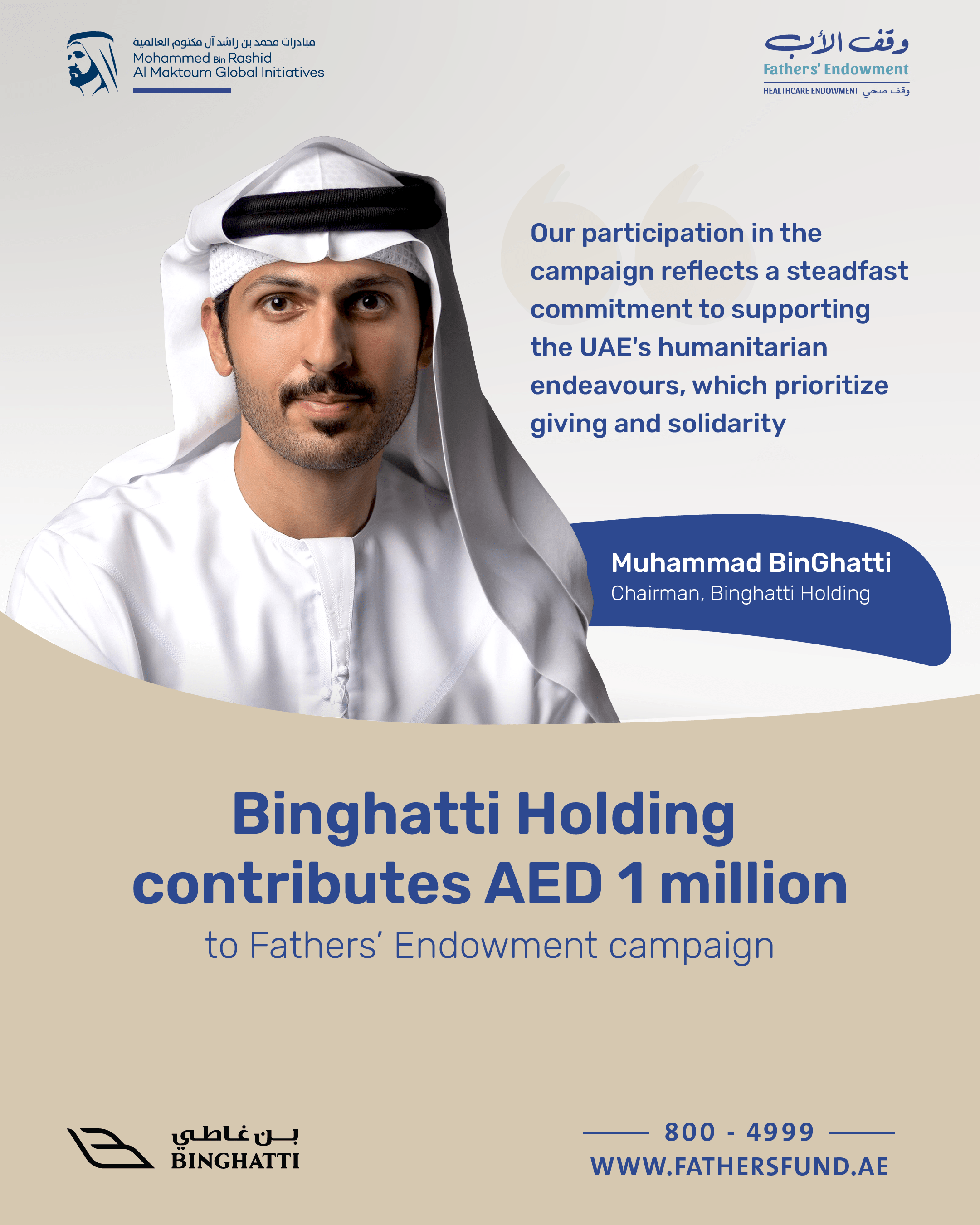 أعلنت شركة "بن غاطي القابضة" عن مساهمتها بمبلغ مليون درهم دعماً لحملة "وقف الأب"، التي أطلقها صاحب السمو الشيخ محمد بن راشد آل مكتوم نائب رئيس الدولة رئيس مجلس الوزراء حاكم دبي "رعاه الله"، بهدف تكريم الآباء في دولة الإمارات، من خلال إنشاء صندوق وقفي مستدام، يخصص ريعه لتوفير العلاج والرعاية الصحية للفقراء والمحتاجين وغير القادرين.