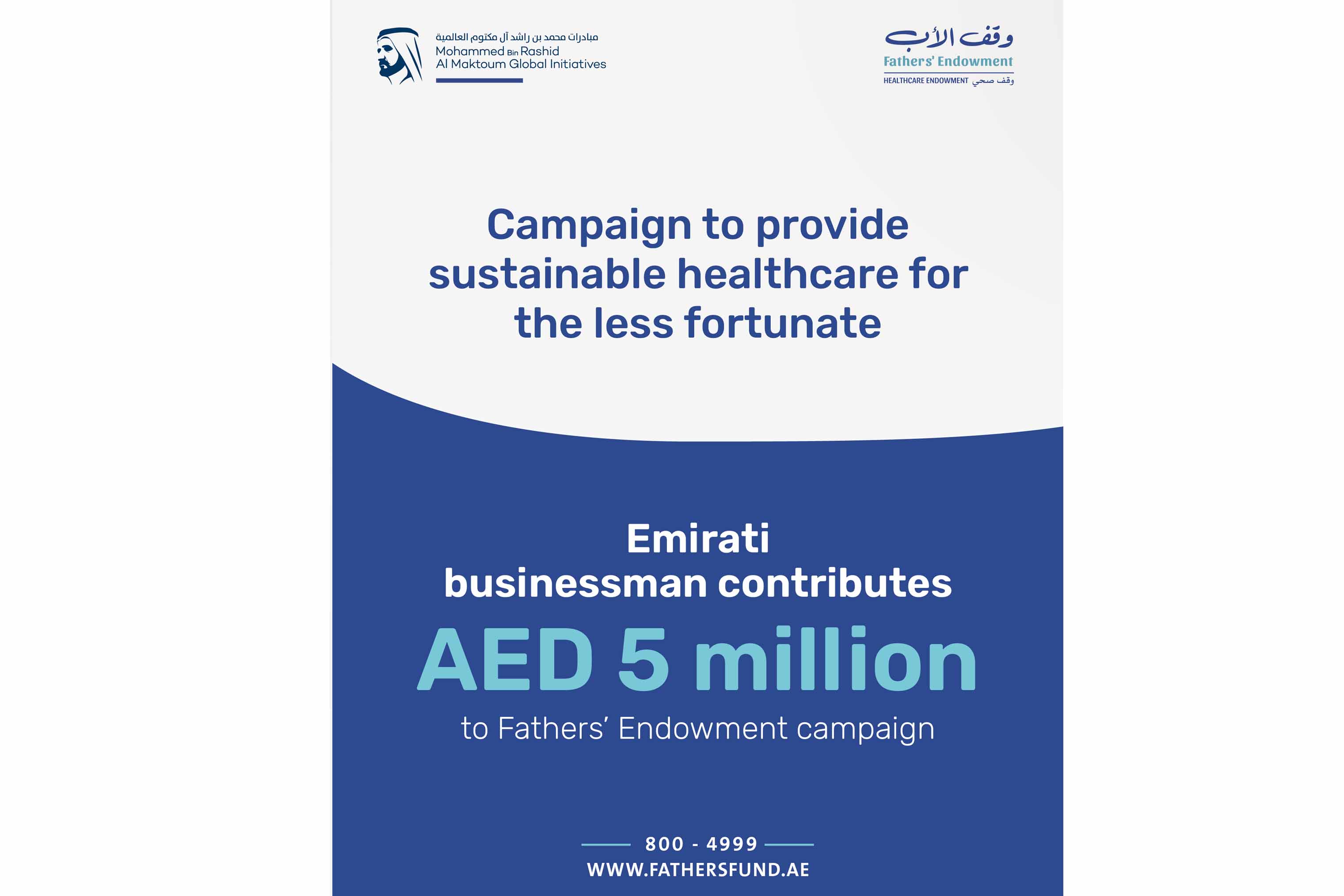 ساهم رجل أعمال إماراتي بمبلغ 5 ملايين درهم دعماً لحملة "وقف الأب" التي أطلقها صاحب السمو الشيخ محمد بن راشد آل مكتوم نائب رئيس الدولة رئيس مجلس الوزراء حاكم دبي "رعاه الله"، بهدف تكريم الآباء في دولة الإمارات من خلال إنشاء صندوق وقفي مستدام، يخصص ريعه لتوفير العلاج والرعاية الصحية للفقراء والمحتاجين وغير القادرين.