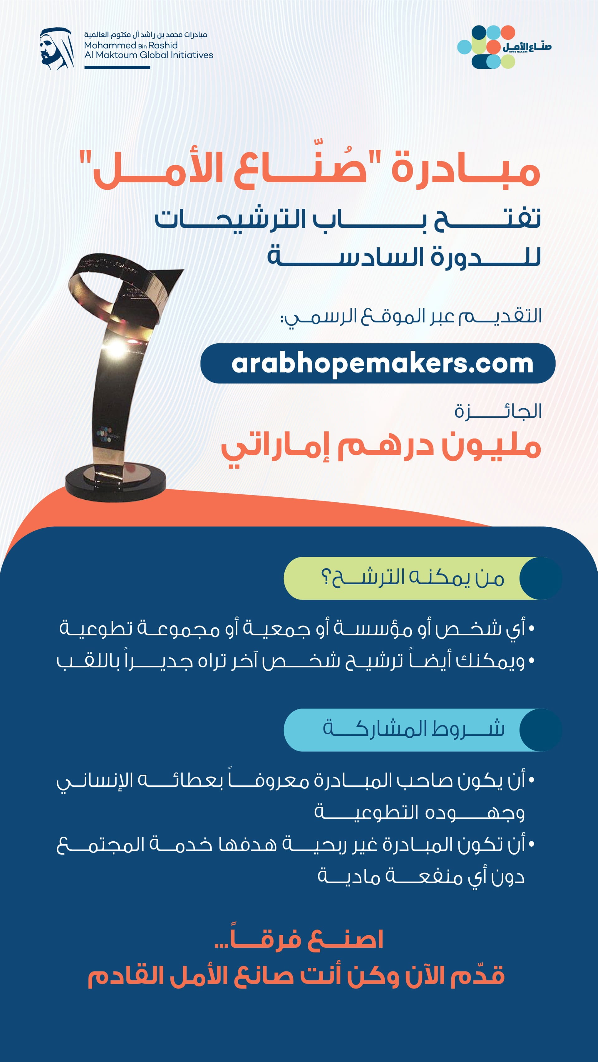 وتستقبل الدورة السادسة من مبادرة "صناع الأمل" طلبات المشاركة والترشيح عبر الموقع arabhopemakers.com.