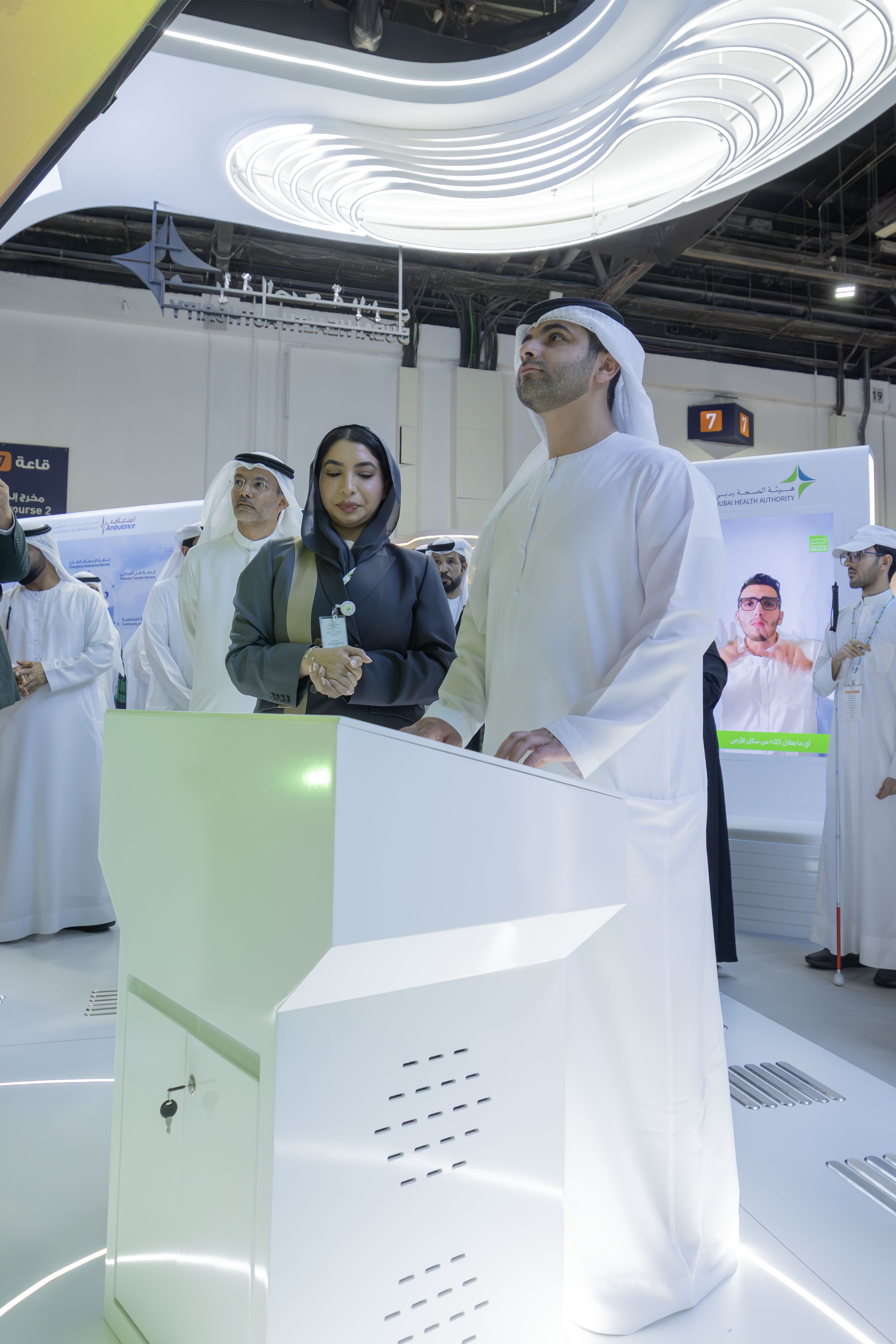 وتوقف سموه أمام منصة هيئة الصحة في دبي، حيث تعرف على ما تقدمه الهيئة من مشاريع وخدمات تقنية وتوعوية من منظور أصحاب الهمم، حيث تعرض المنصة مشروع "القبة" التي يتعرف الزوار من خلالها على طريقة التعامل مع المصابين بطيف التوحد، وكذلك الشاشات التفاعلية التي تُعلم الزوار بعض الكلمات الضرورية بلغة الإشارة، ولغة برايل.
