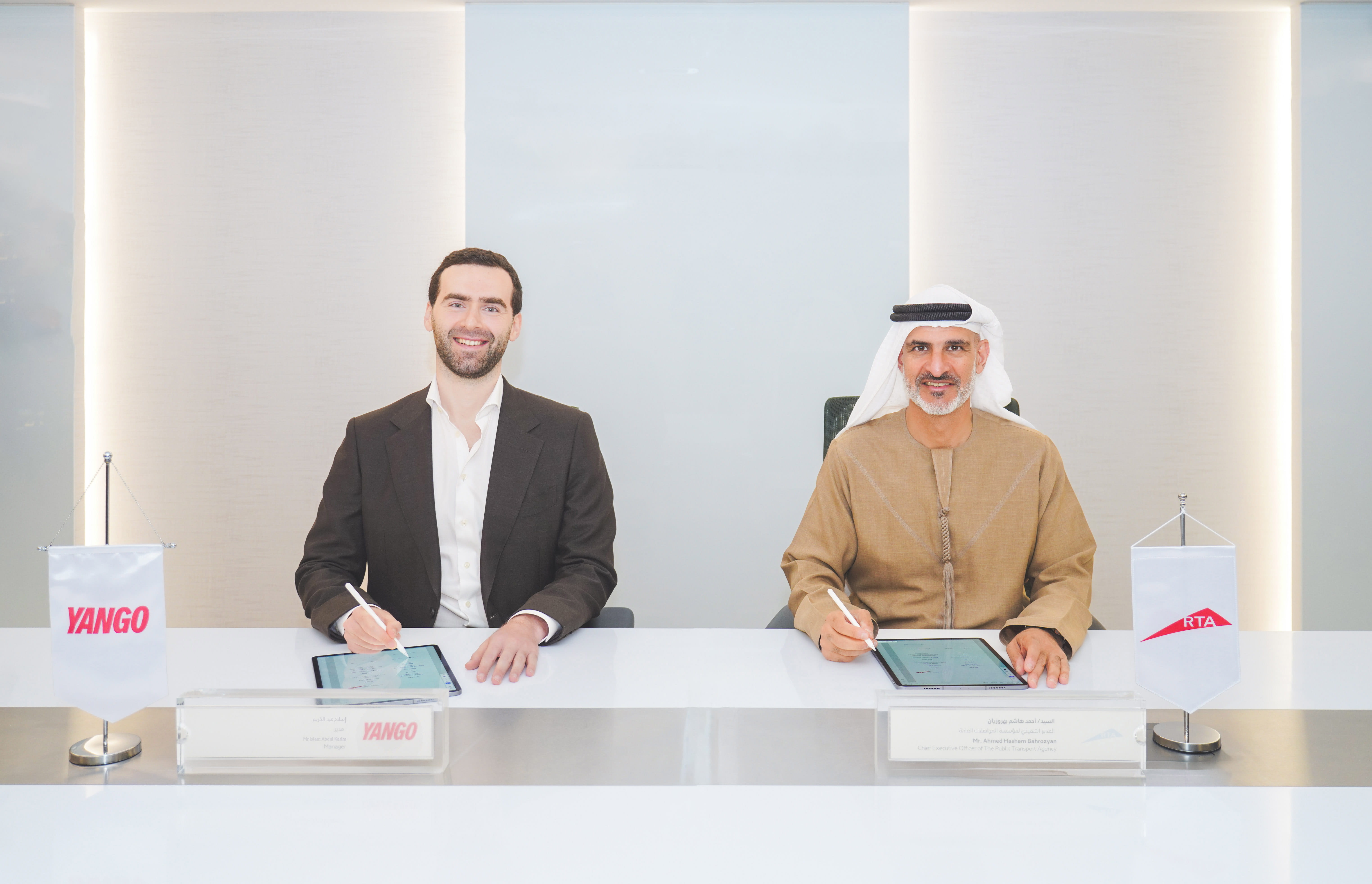 وقّع المذكرة بالنيابة عن هيئة الطرق والمواصلات، أحمد هاشم بهروزيان، المدير التنفيذي لمؤسسة المواصلات العامة، ووقعها بالنيابة عن مجموعة يانغو، إسلام عبد الكريم، المدير الإقليمي لمجموعة يانغو. ووقعها عن (أوربان إكسبريس للنقل)، الدكتور محمد الهاشمي، المؤسس والمدير التنفيذي للشركة.
