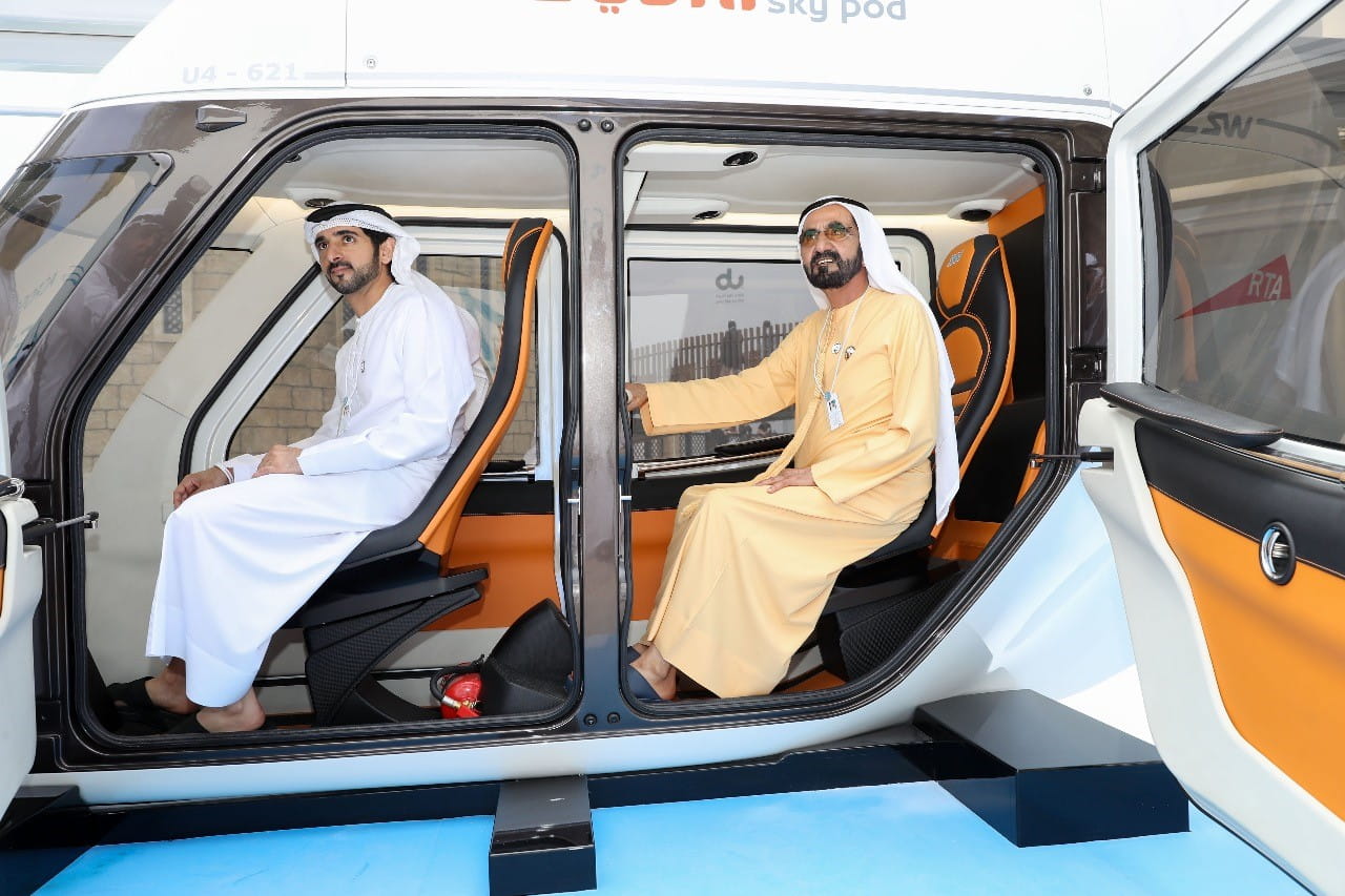 His Highness inspected the Sky Pods on the sidelines of the World Government Summit in the presence of HH Sheikh Hamdan bin Mohammed bin Rashid Al Maktoum, Dubai Crown Prince, Chairman of The Executive Council of Dubai and Chairman of the Board of Trustees of the Dubai Future Foundation.
