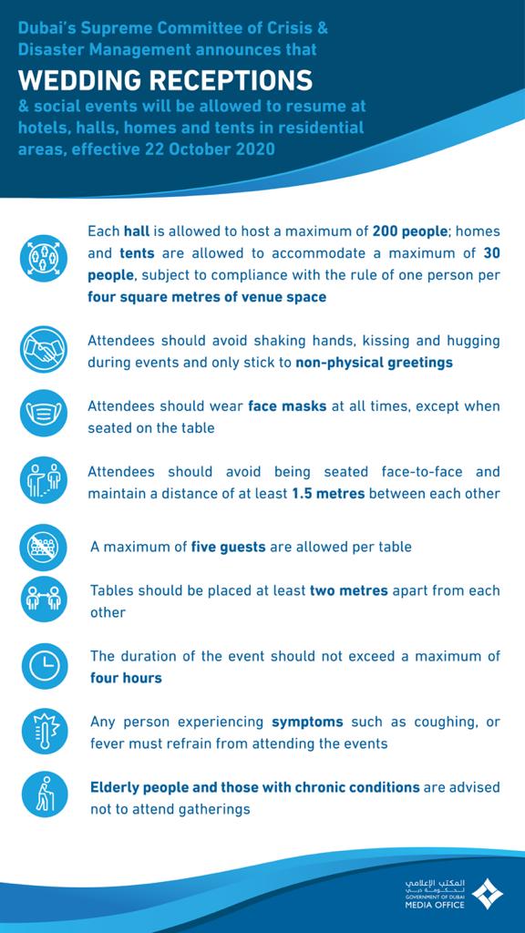 The Supreme Committee of Crisis and Disaster Management in Dubai, headed by His Highness Sheikh Mansoor bin Mohammed bin Rashid Al Maktoum, announced that wedding receptions will be allowed to resume in hotels, halls, homes, temporary venues, and tents in residential areas effective from 22 October 2020.
