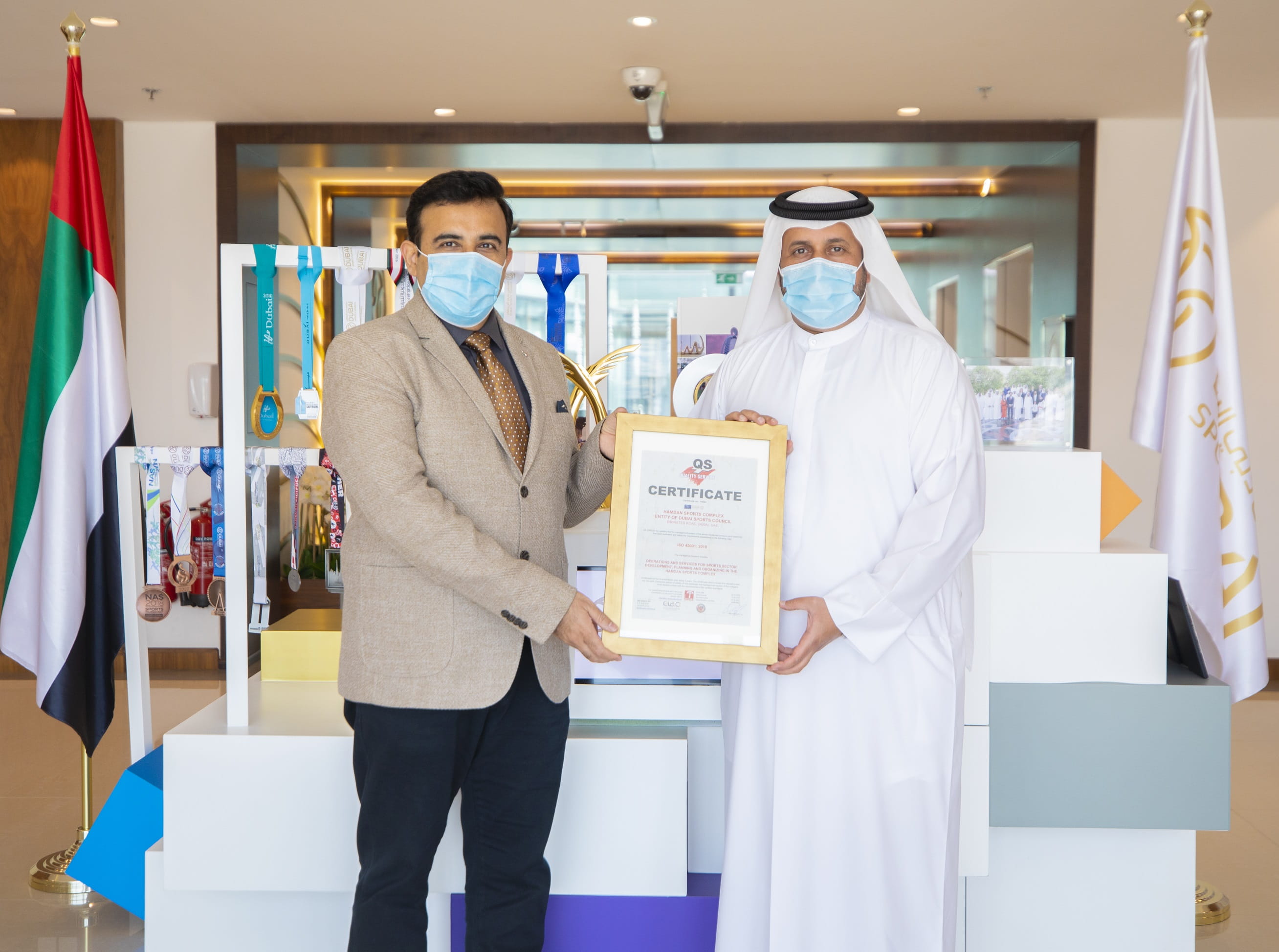 His Excellency Saeed Hareb, Secretary General of Dubai Sports Council, received the certificates from the Middle East representatives of ISO in the presence of Ahmed Al Shafar, Chairman of the Board of Directors of Hamdan Sports Complex, Nasser Aman Al Rahma, Assistant Secretary General of DSC, and Abdulla Shahdad, Director of the Complex.