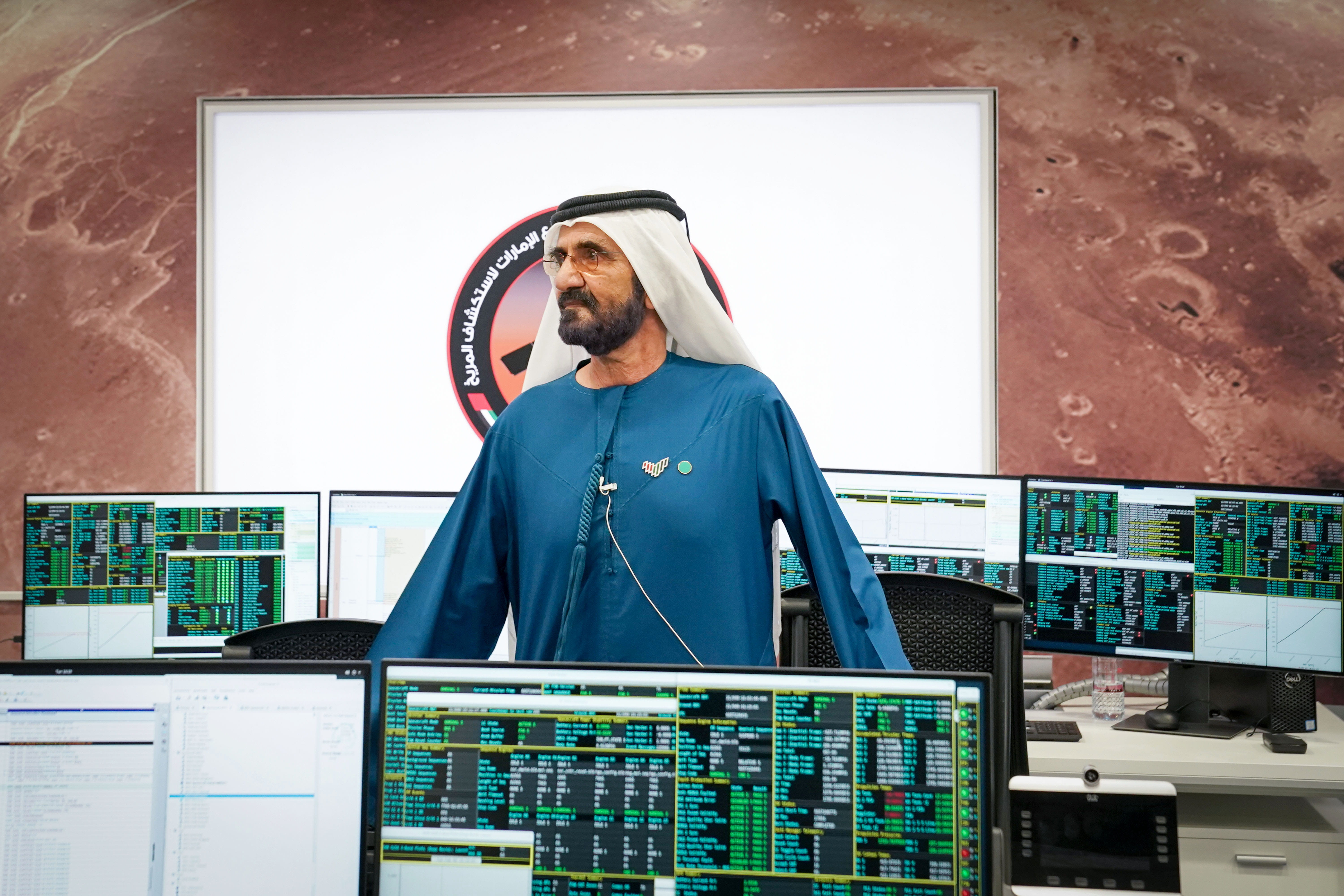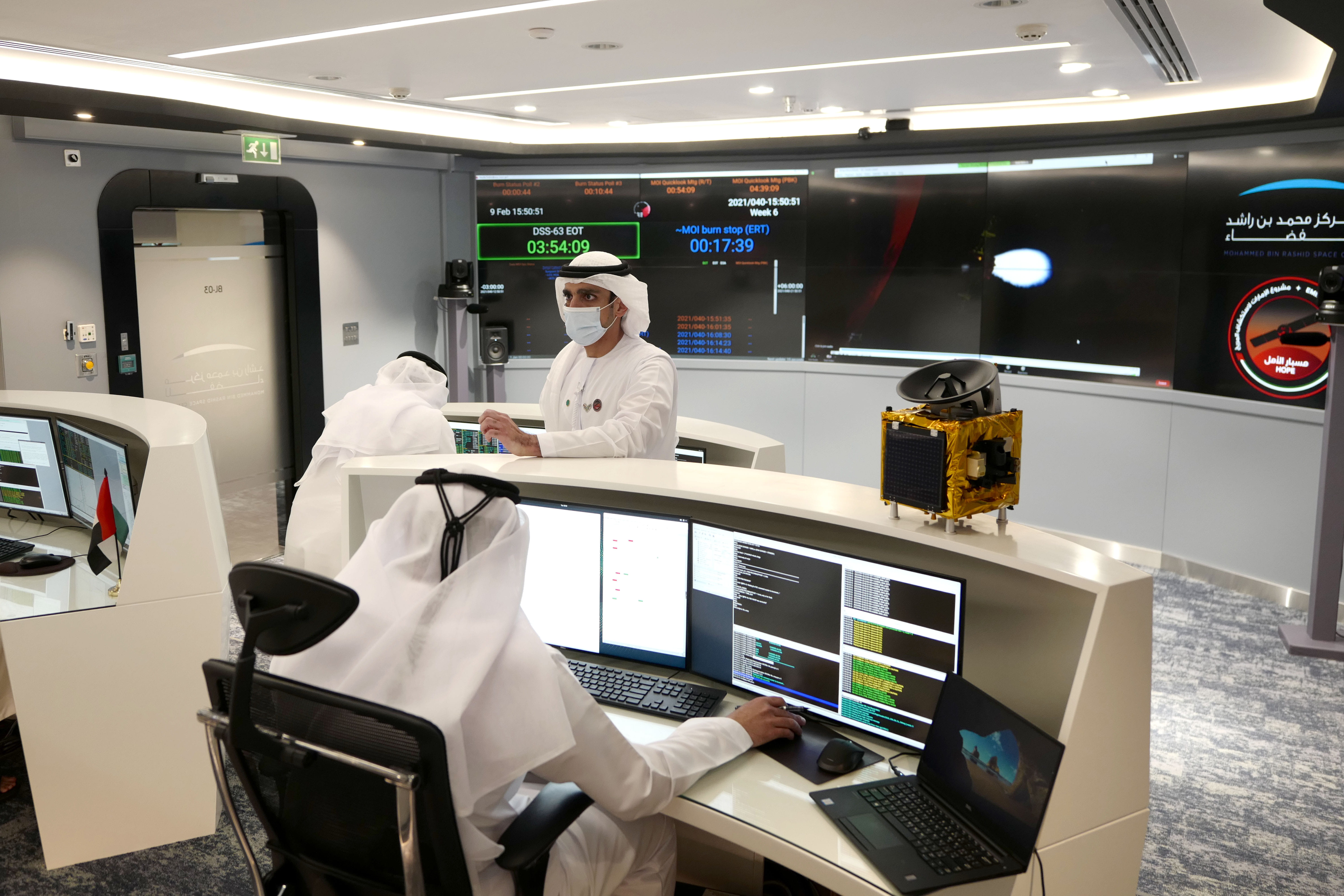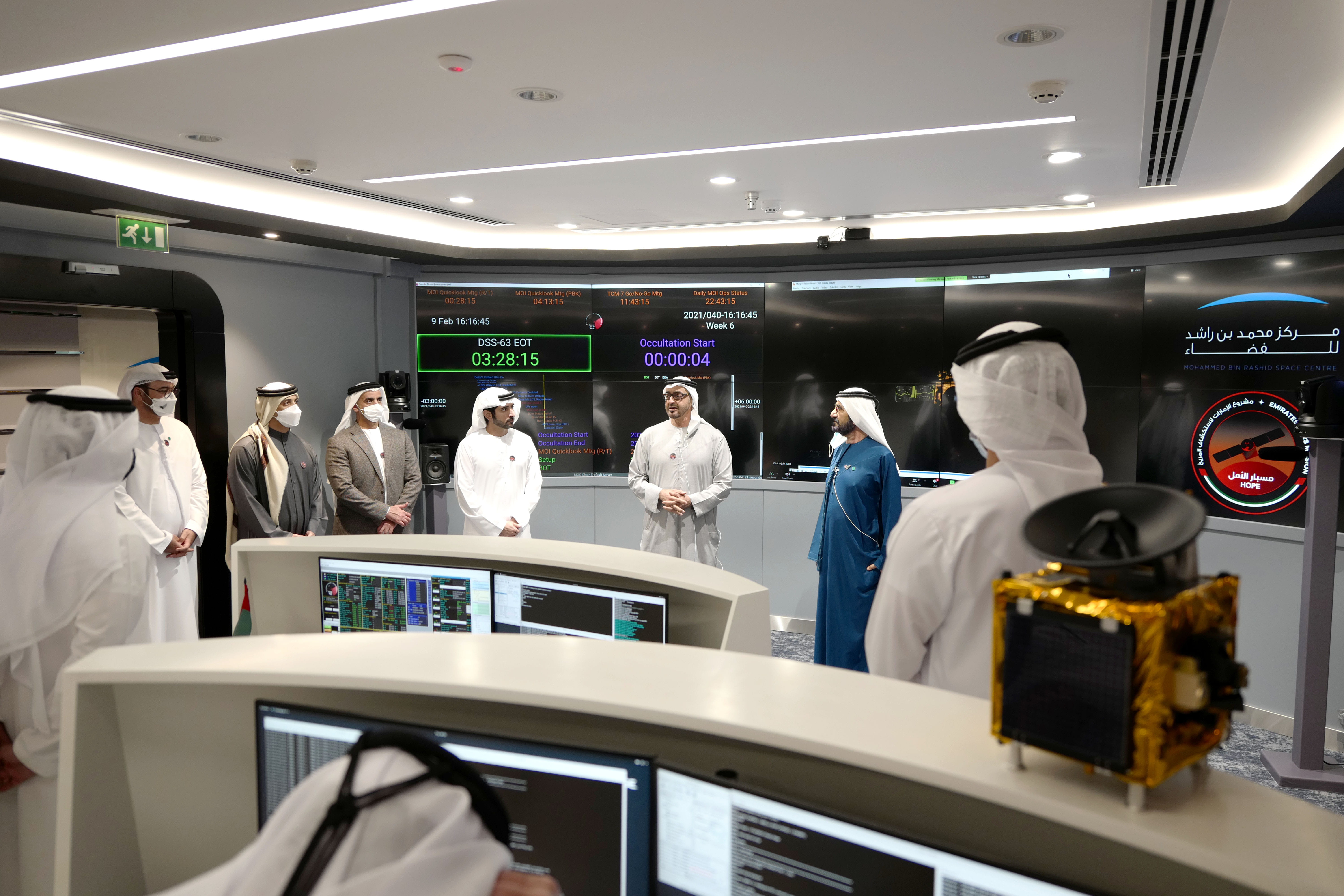 The Rulers of Dubai and Abu Dhabi celebrated the project as a great success for the UAE, the wider Arab region and the global scientific community following six years of technical and logistical efforts to complete the project. They hailed the team of engineers and scientists behind the project who made it a reality after relentless efforts. His Highness Sheikh Mohammed bin Rashid Al Maktoum, Vice President and Prime Minister of the UAE and Ruler of Dubai; and His Highness Sheikh Mohamed bin Zayed Al Nahyan, Crown Prince of Abu Dhabi and Deputy Supreme Commander of the UAE Armed Forces witnessed the historic moment at the Ground Control Station at the Mohammed Bin Rashid Space Centre in Al Khawaneej in the presence of His Highness Sheikh Hamdan bin Mohammed bin Rashid Al Maktoum, Crown Prince of Dubai, Chairman of The Executive Council of Dubai and Chairman of the Mohammed Bin Rashid Space Centre; His Highness Lieutenant General Sheikh Saif bin Zayed Al Nahyan, Deputy Prime Minister and Minister of Interior; and His Highness Sheikh Mansour bin Zayed Al Nahyan, Deputy Prime Minister and Minister of Presidential Affairs.