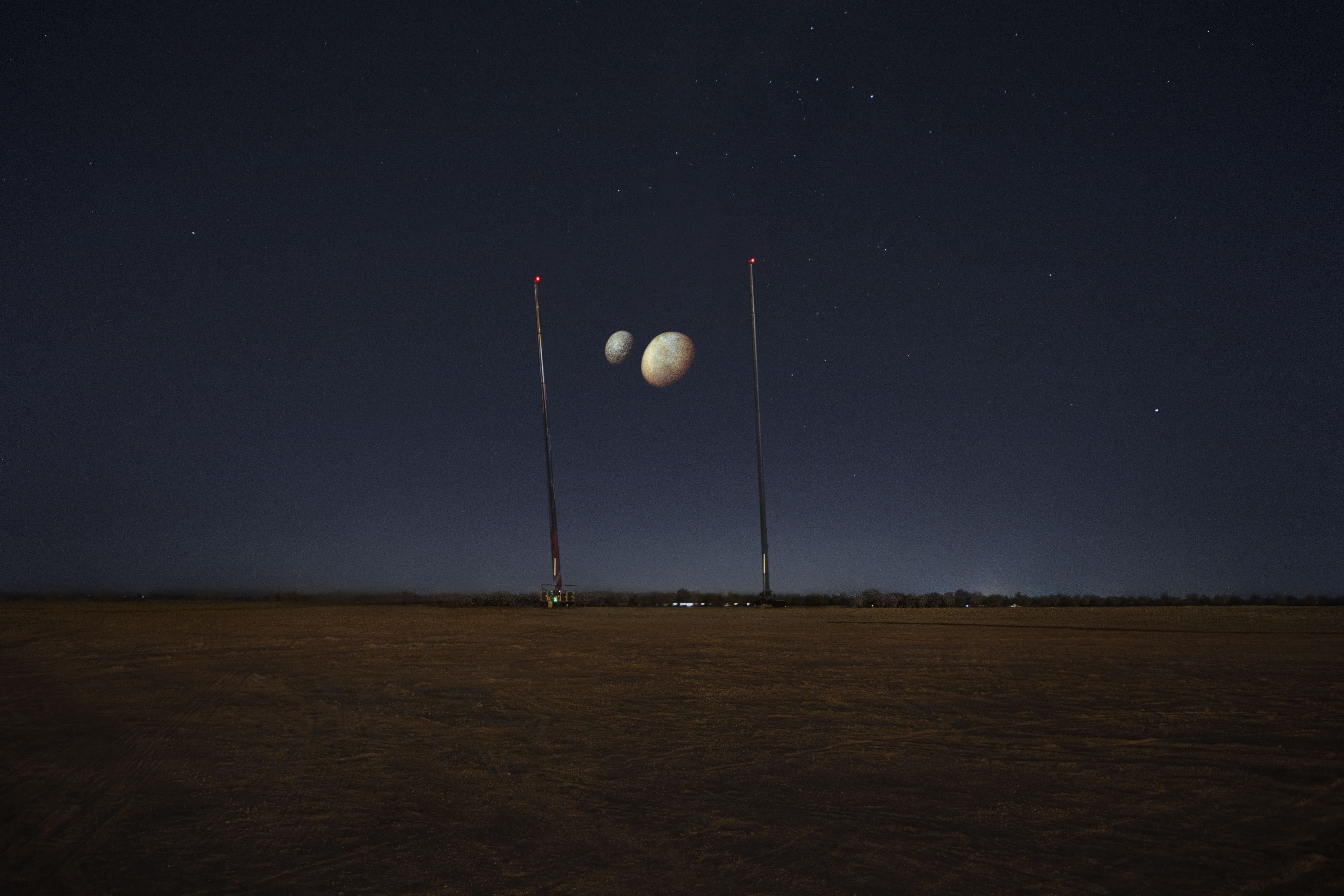 Phobos and Deimos, the two moons orbiting Mars, were projected in the sky using a new technology that has never been seen before in the UAE, two giant 100-meter cranes and an advanced 40-meter screen have been used to make the moons appear realistically in the sky and visible from long distances.