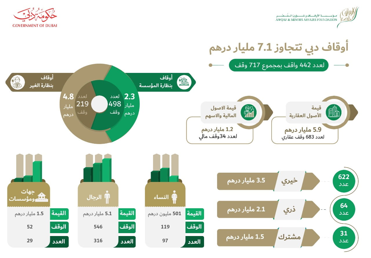 By the end of 2020, the total number of endowments registered by the Awqaf and Minors Affairs Foundation in Dubai stood at 717, representing a total value of AED7 billion. These endowments have been registered by 442 endowers.