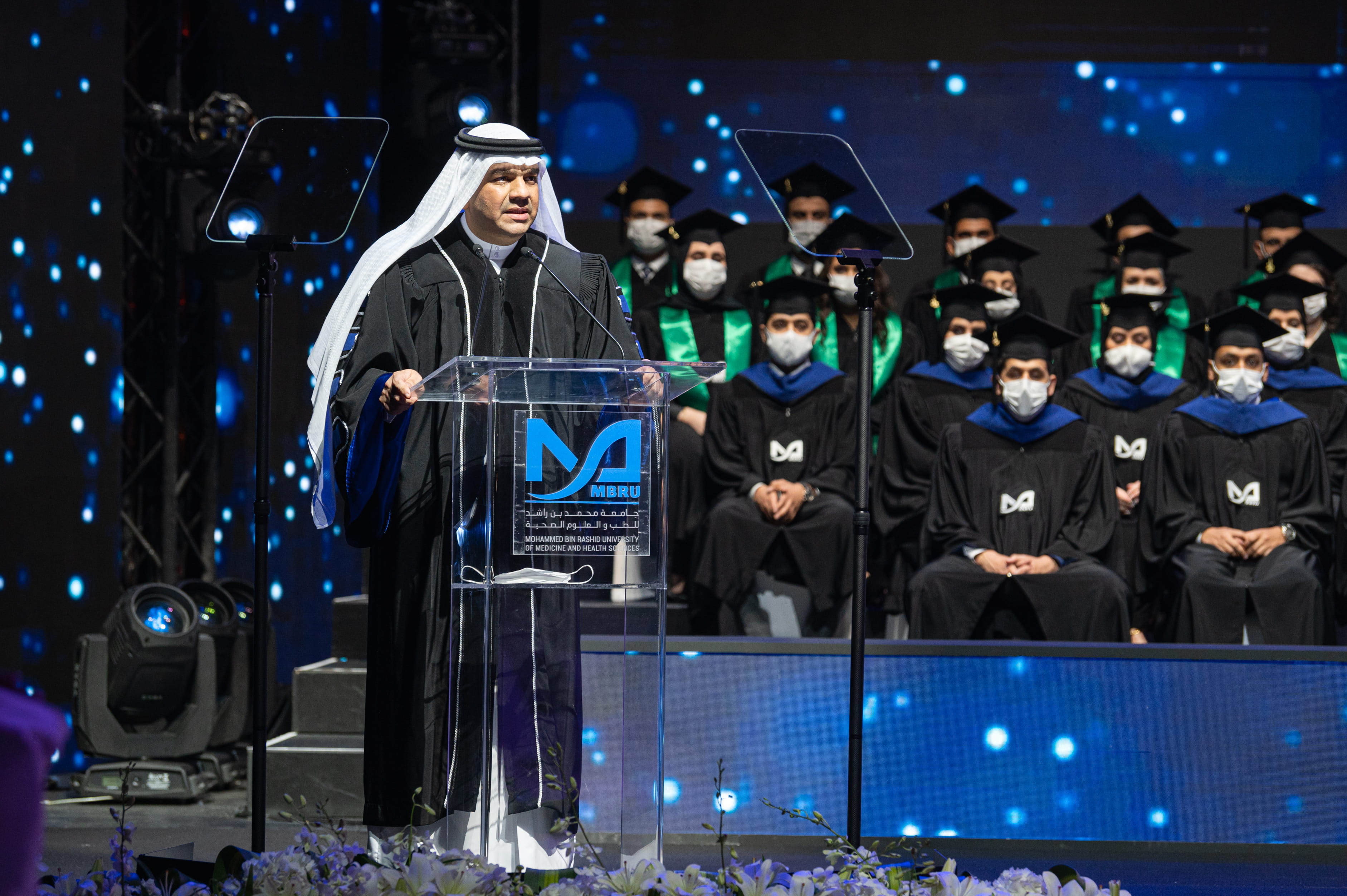 In his welcome address, Dr. Amer Sharif, President of MBRU and CEO of Dubai Academic Health Corporation, thanked the leadership whose exceptional support and trust played a significant role in the University's development and growth. He also praised the tireless efforts of the students, the MBRU team, the University's academic partner, Queen's University Belfast, and all MBRU's friends, partners, supporters, and donors who trusted the University's vision and contributed to realising its goals.