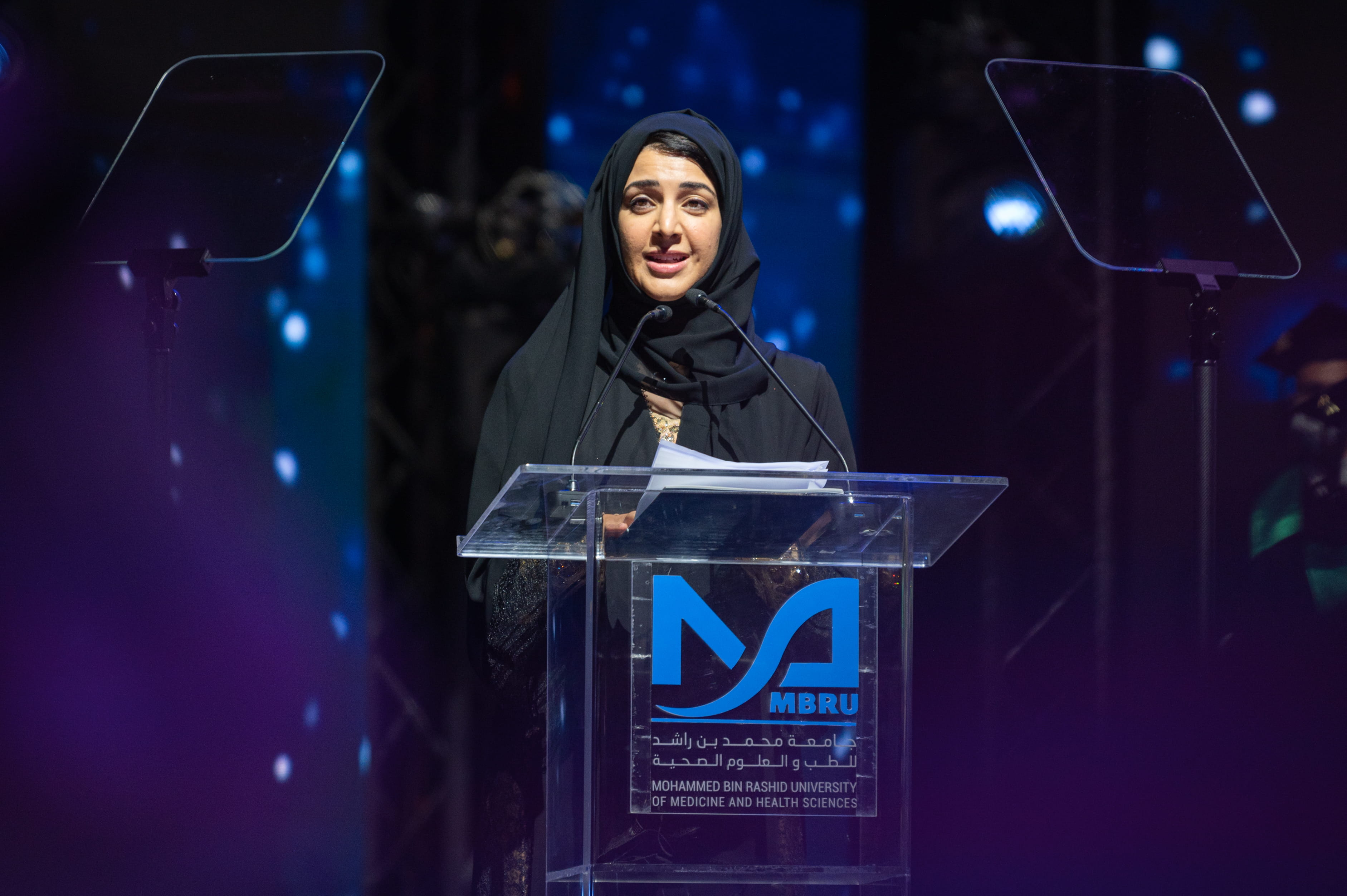 Her Excellency Dr. Raja Al Gurg, Member of Dubai Academic Health Corporation's Board of Directors, delivered the opening speech on behalf of MBRU's Chancellor, His Highness Sheikh Ahmed bin Saeed Al Maktoum, encouraging the graduates to use their experience and knowledge in promoting healthcare, medical education, and research to advance health and serve humanity.