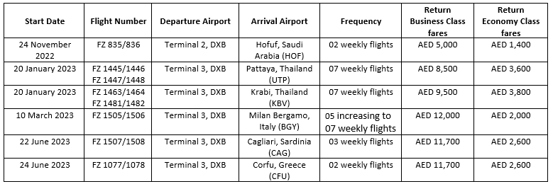 • The Dubai-based airline adds six destinations to its network with flights to Cagliari, Corfu, Hofuf, Krabi, Milan and Pattaya