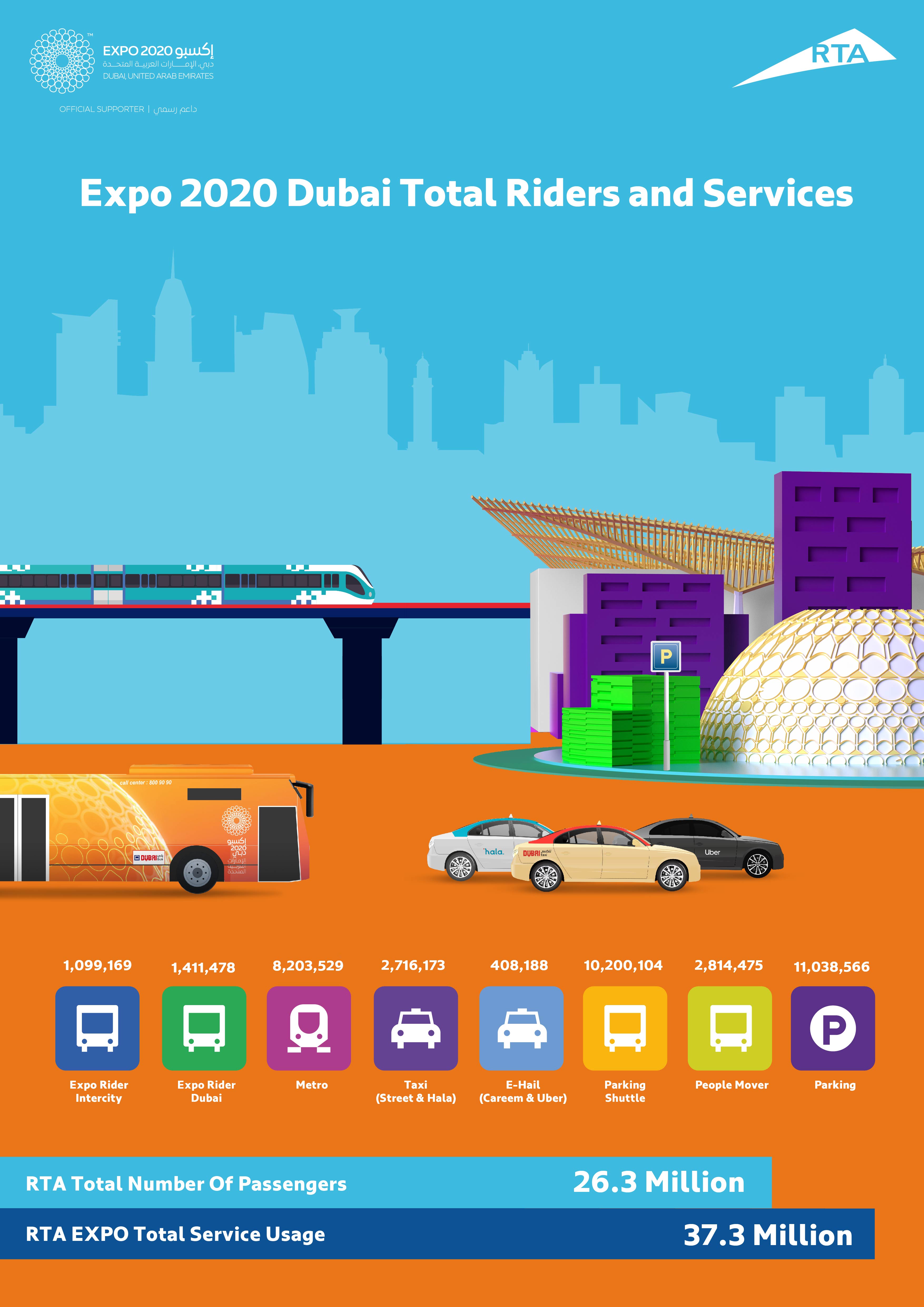 His Excellency Mattar Al Tayer, Director-General, Chairman of the Board of Executive Directors of the Roads and Transport Authority (RTA) revealed that the number of usages of RTA services during the period of Expo 2020 Dubai amounted to 37.3 million, which constitutes 67% to the total usage of transport services at Expo. The number of riders carried out by public transport modes (Dubai Metro, public buses), taxis and e-hail rides (Careem and Uber) reached 26.3 million. He noted that RTA’s transit means served 37% of Expo visitors, and about 11.038 million motorists used RTA’s parking slots during Expo.