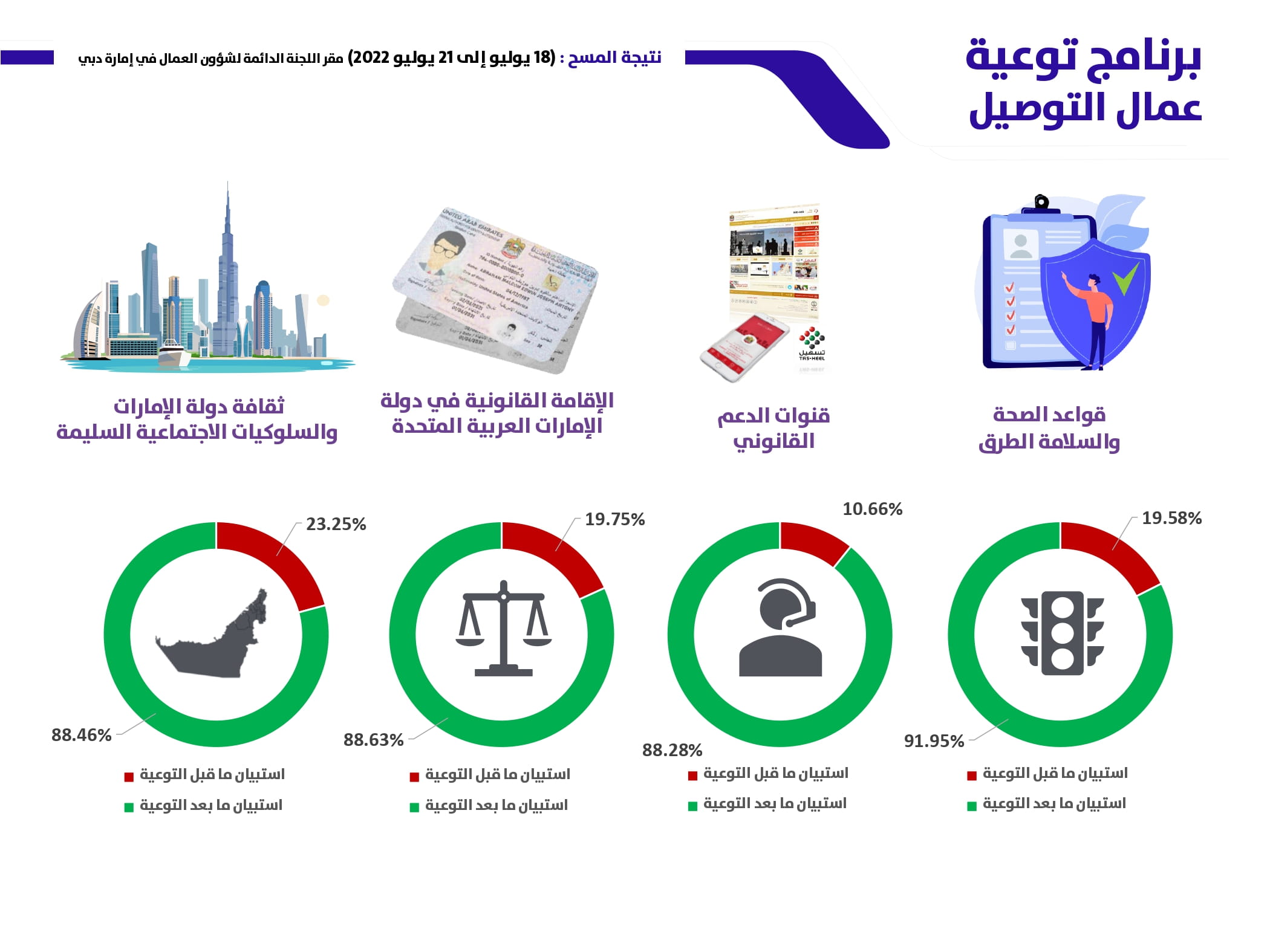 The preliminary results of recent surveys conducted by the PCLA demonstrate a significant increase in the workers’ knowledge across all topics covered. Awareness among workers about residency and labour laws in the UAE increased from 19.75% before the training to 88.63% on completion. Knowledge of the various types of UAE Government support channels rose from 10.66% to 88.3%, while the percentage of correct answers on health and road safety issues increased from 19.6% to 91.9%. Workers’ understanding of the UAE’s culture and acceptable and unacceptable behaviours increased from 23.25% to 88.46%.