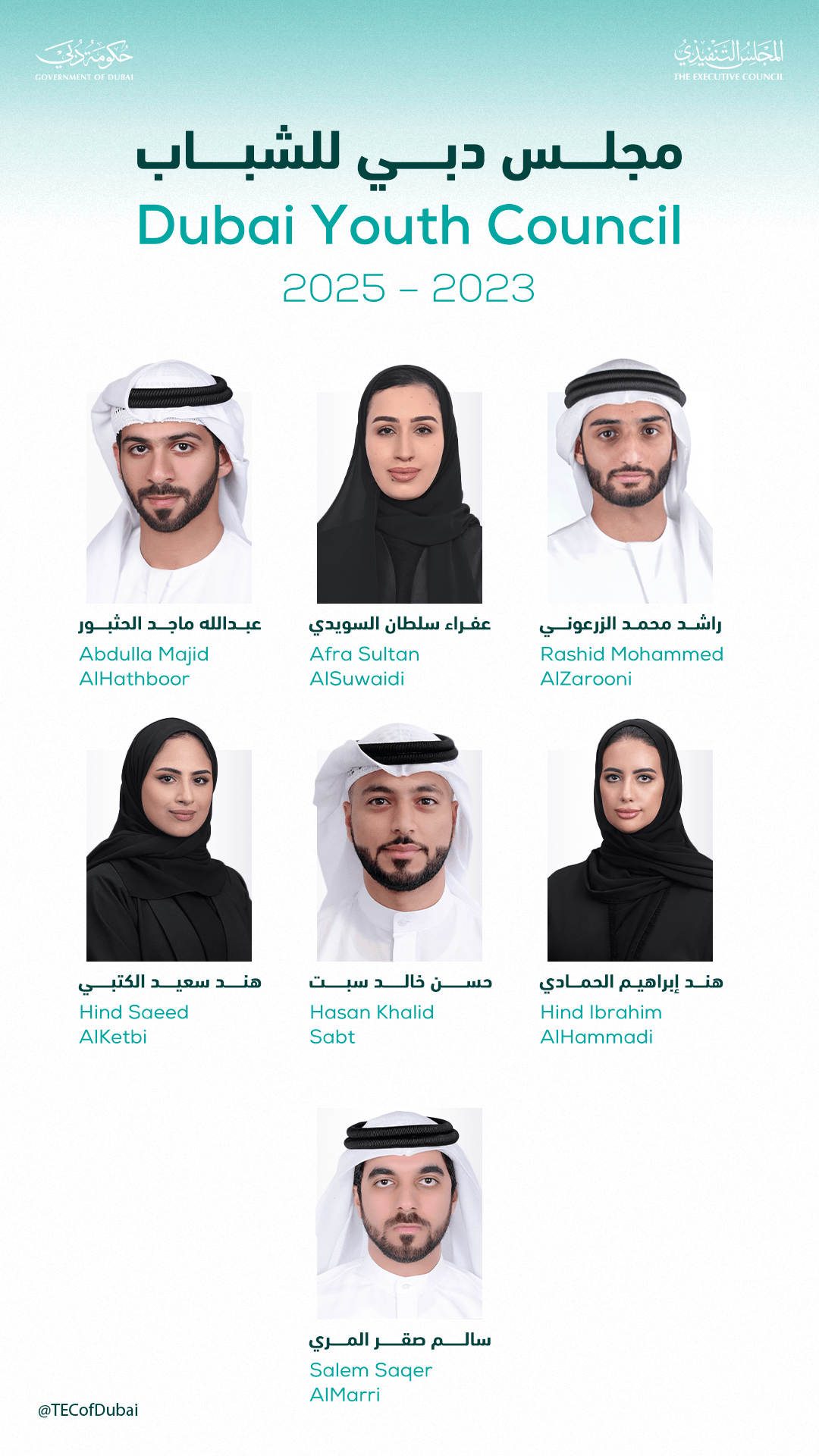 The members of the Dubai Youth Council for 2023-2025 include Abdulla Majid Al Hathboor Al Rumaithi, Afra Sultan Al Suwaidi, Rashid Mohammed Al Zarooni, Hasan Khalid Sabt, Hind Ibrahim Mohammed Al Hammadi, Salem Saqr Majid Saqr Al Marri, and Hind Saeed Mohammed Matar Al Ketbi.