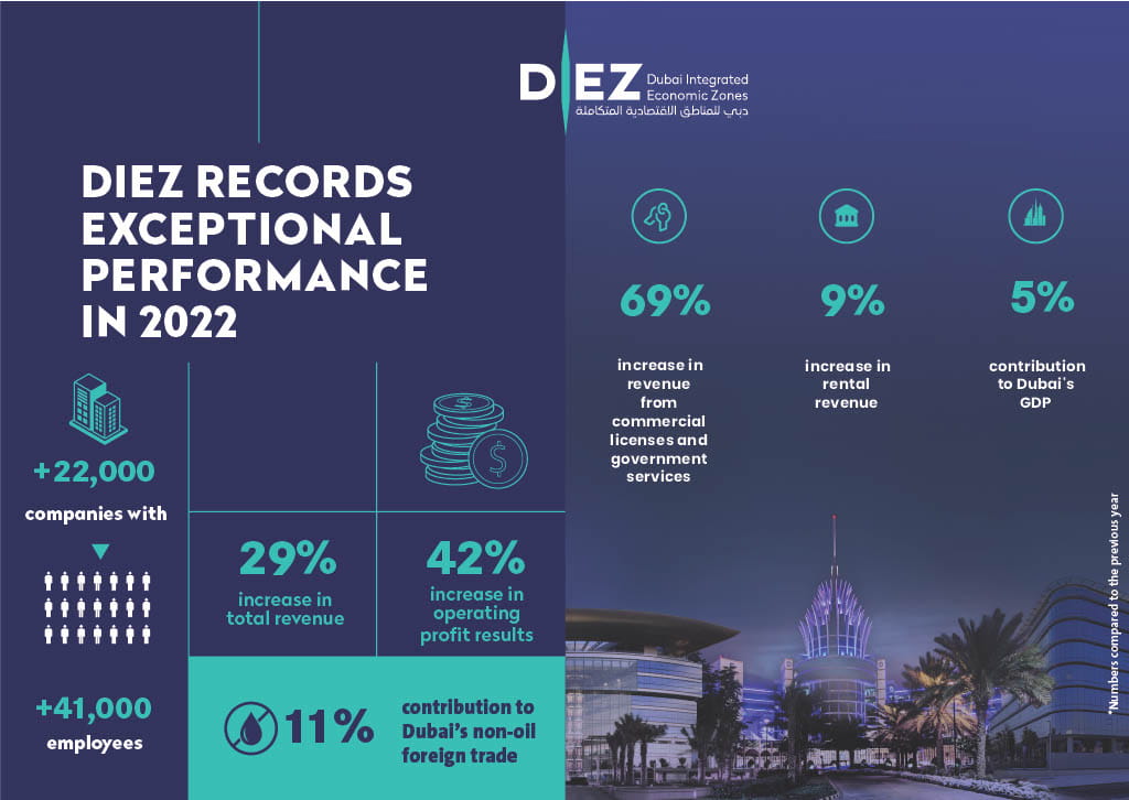 The Dubai Integrated Economic Zones Authority (DIEZ) recorded a 42% increase in its operating profit in 2022, while total revenue increased by 29%, compared to 2021. The exceptional performance, which resulted in a 9% increase in rental revenue and a 69% increase in revenue from commercial licenses, government services and other services in 2022, signifies the effectiveness of DIEZ’s new integrated model and the Authority's growing contribution to the economic development of Dubai and the UAE.
