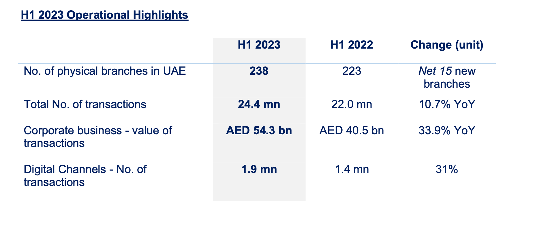• H1 2023 Net profit was AED 263 million, registering a 2.5% decline compared to H1 2022. The drop in net profit was predominantly driven by lowering remittance margins, higher costs as well as an increase in financing costs related to interest paid on a loan drawn in December 2022.