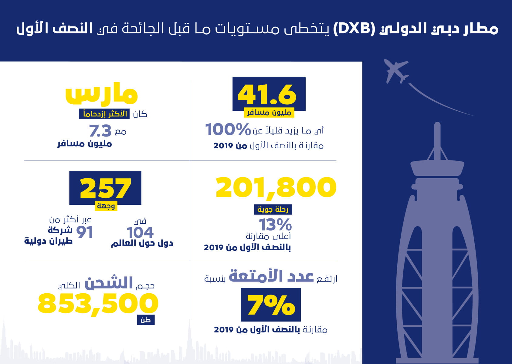 DXB handled a total of 201,800 flights in the first half, up 30.2% year on year, up 13% compared to the same period in H1 2019. The average number of guests per flight during the first half reached 214 while the load factor was 77%.