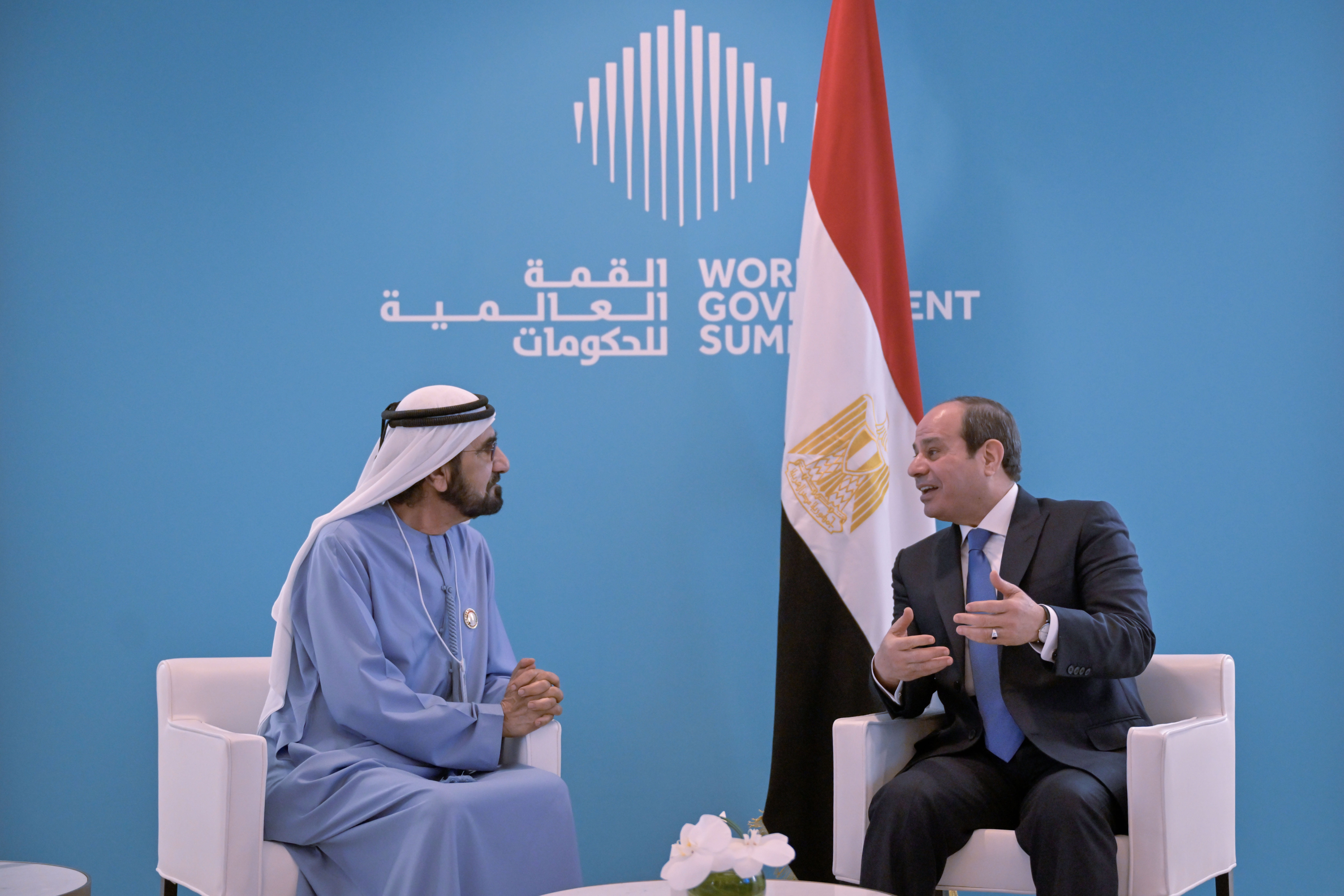 His Highness Sheikh Mohammed bin Rashid’s meeting with the Egyptian President was also attended by His Highness Sheikh Ahmed bin Saeed Al Maktoum, President of the Dubai Civil Aviation Authority and Chairman and Chief Executive of Emirates Airline and Group; His Highness Sheikh Ahmed bin Mohammed bin Rashid Al Maktoum, Chairman of the Dubai Media Council; His Highness Sheikh Mansoor bin Mohammed bin Rashid Al Maktoum, Chairman of the Dubai Sports Council; and His Excellency Mohammad bin Abdullah Al Gergawi, Minister of Cabinet Affairs and Chairman of the World Government Summit Organisation.