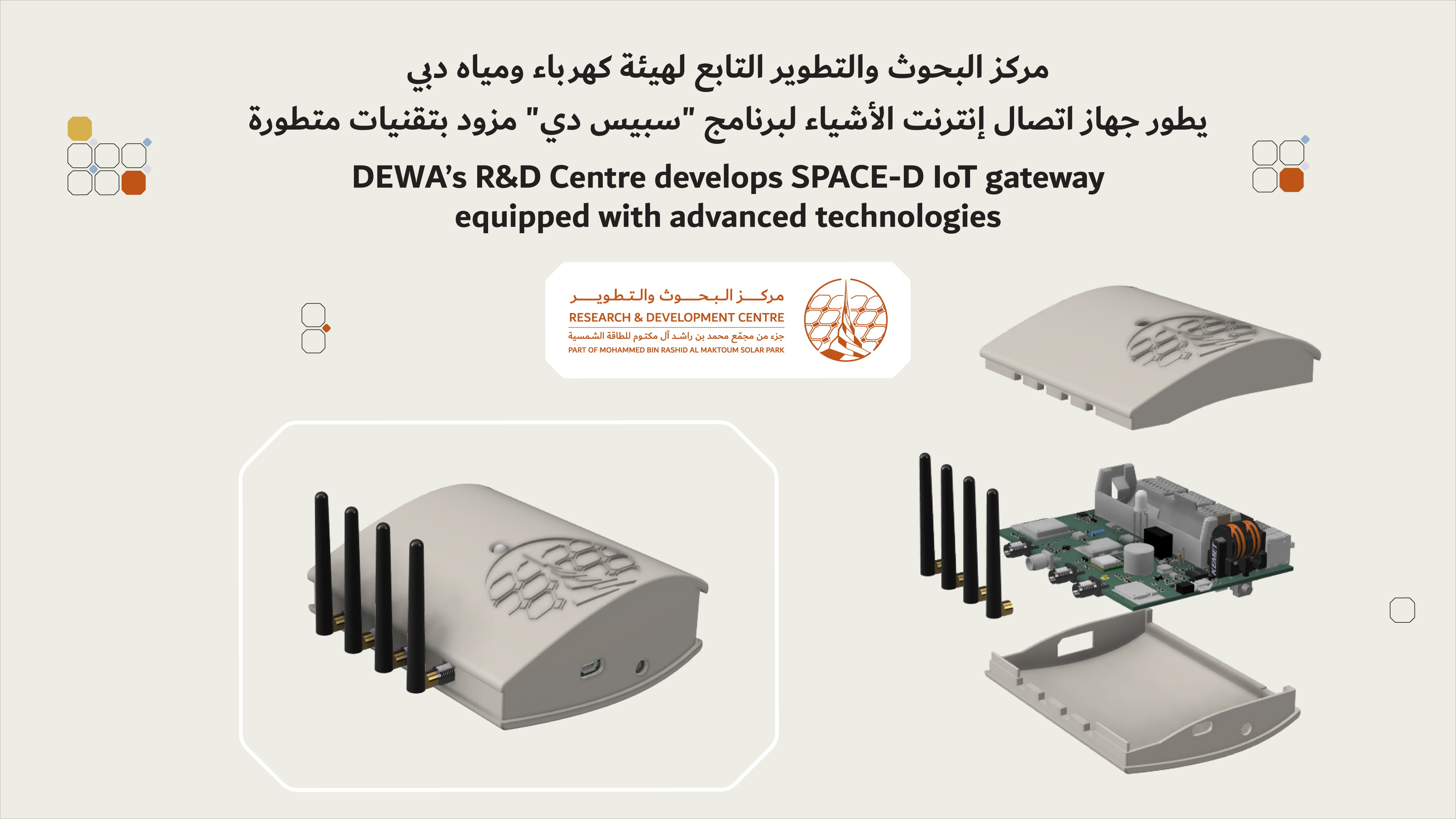 As part of Dubai Electricity and Water Authority (DEWA)’s Space-D programme, DEWA’s Research and Development (R&D) Centre has developed an in-house, versatile gateway that can connect terrestrial sensors to satellites and ground networks. The gateway has various physical, operational technology (OT) connectivity and IoT edge protocol libraries to support the latest IoT communication network like LoRa, Wi-Fi & BLE. The device is designed to suit various industrial applications such as utilities, infrastructure, asset-tracking, agriculture, smart cities, fleet management and others. The device has a long battery life to support various LoRa protocols and LoRaWAN to communicate directly with several satellites and terrestrial network, which contributes to a significant reduction in device and operational costs. The device complies with international IoT device security standards, including OT security. The device was fully designed, fabricated and tested at DEWA’s R&D Centre and its enclosure was manufactured at the R&D’s labs using 3D printing.