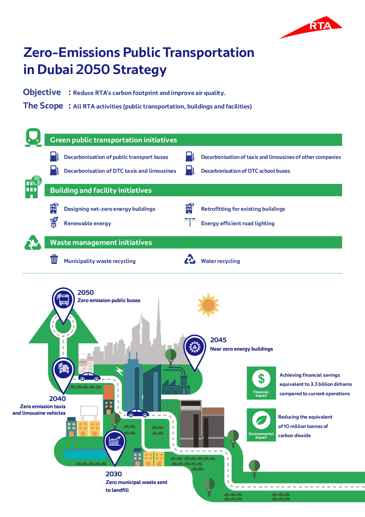 Dubai's Roads and Transport Authority (RTA) has rolled out its 'Zero-Emissions Public Transportation in Dubai 2050' strategy, which makes it the first Middle Eastern agency to develop a long-term strategy for migrating towards Net-Zero Emission Public Transport by 2050. With this strategy, RTA aims to contribute to mitigating climate change and minimise its carbon footprint across three areas: public transportation, buildings and related facilities, and waste management.