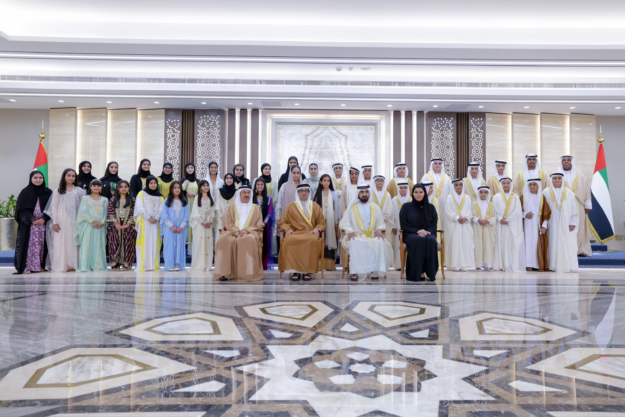 His Highness Sheikh Mohammed bin Rashid took a commemorative photo with ECP members, in the presence of His Highness Sheikh Mansour bin Zayed Al Nahyan, Vice President, Deputy Prime Minister and Chairman of the Presidential Court; His Excellency Saqr Ghobash, Speaker of the Federal National Council; and Her Excellency Reem Abdullah Al Falasi, Secretary General of the Supreme Council for Motherhood and Childhood.
