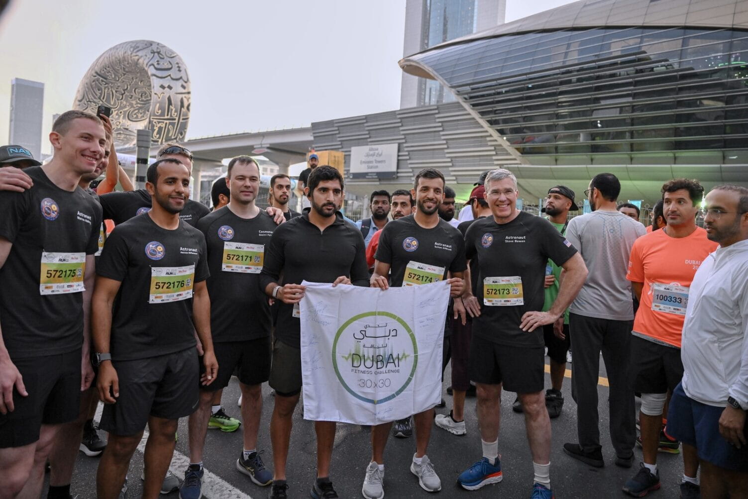 At the launch of the fifth edition of the Dubai Run, astronaut Dr. Al Neyadi presented the Dubai Fitness Challenge flag to HH Sheikh Hamdan bin Mohammed. The gesture symbolises appreciation for His Highness' unwavering commitment to the wellbeing and happiness of the Dubai community by encouraging the adoption of sports as a crucial element in preserving human health.