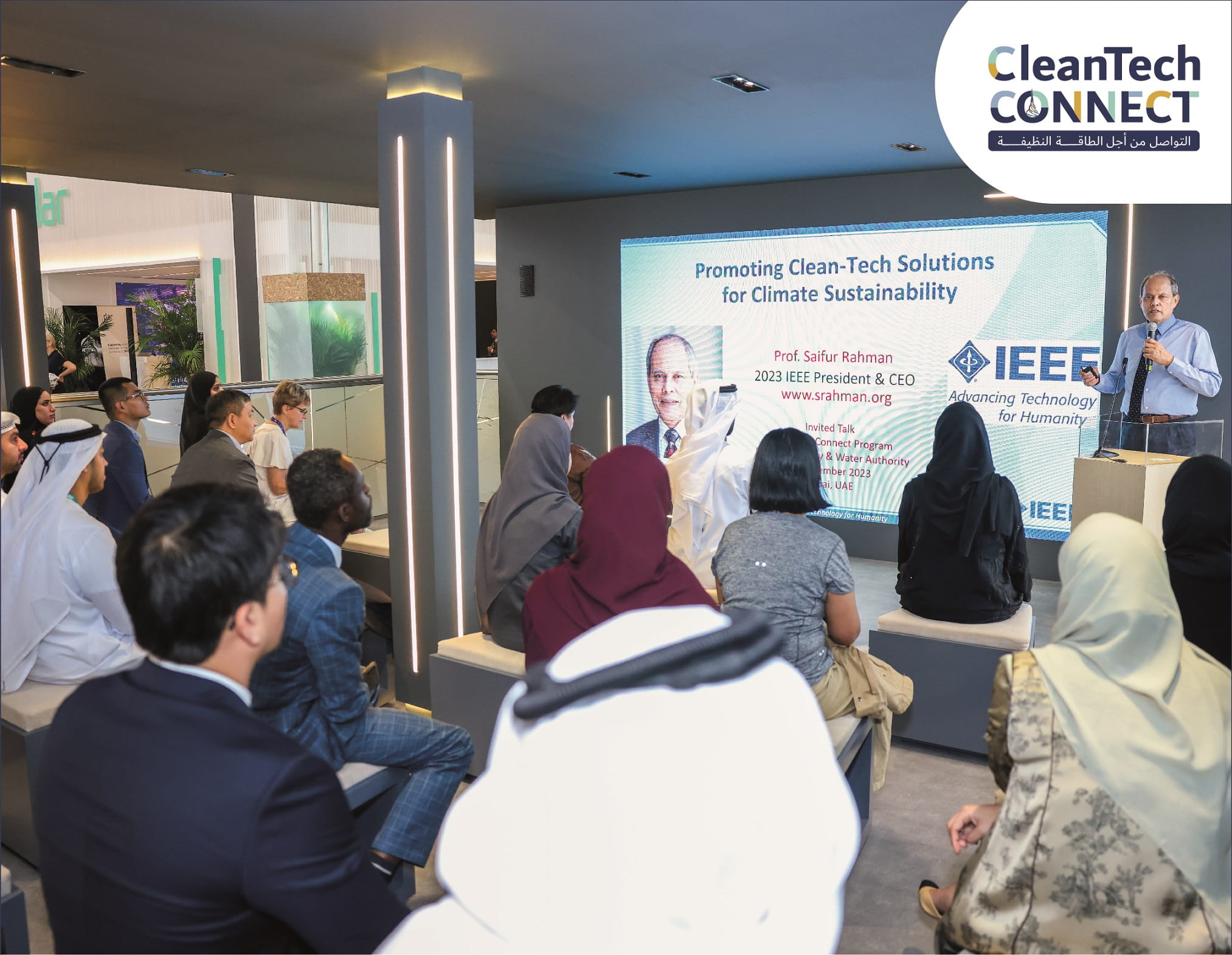 The seminars and discussion panels focused on various aspects of sustainability, solar and clean energy, innovation, and anticipating and shaping the future, with the participation of sustainability experts and specialists. This was within the framework of the Cleantech Connect Programme, launched by DEWA’s Innovation Centre in 2021. Topics included hydrogen as a clean energy source; perovskite solar cells and improving photovoltaic systems performance; Artificial Intelligence (AI) in energy management; Building Integrated Photovoltaics (BIPV); future scenarios for sustainable energy; and energy storage technologies.